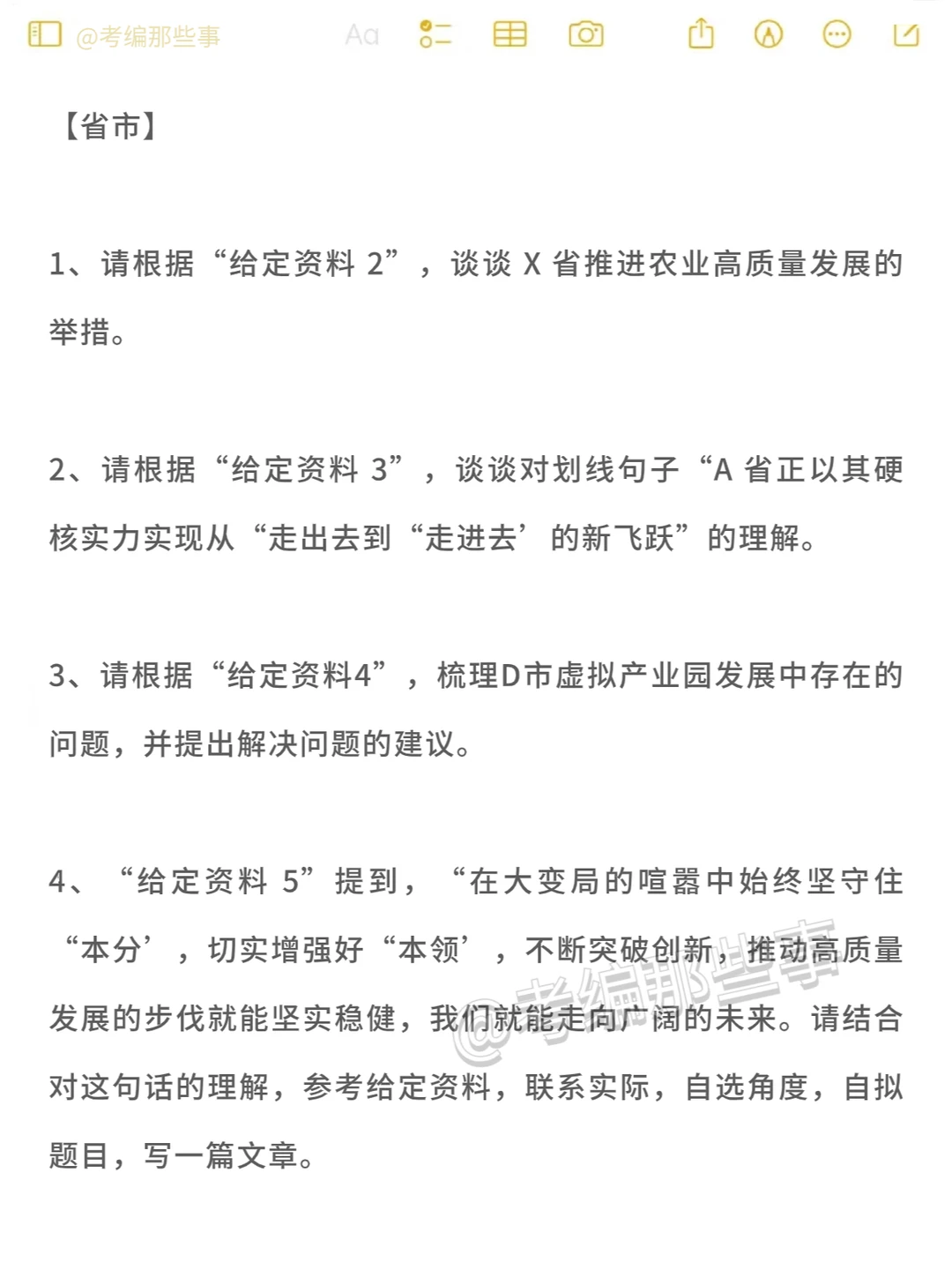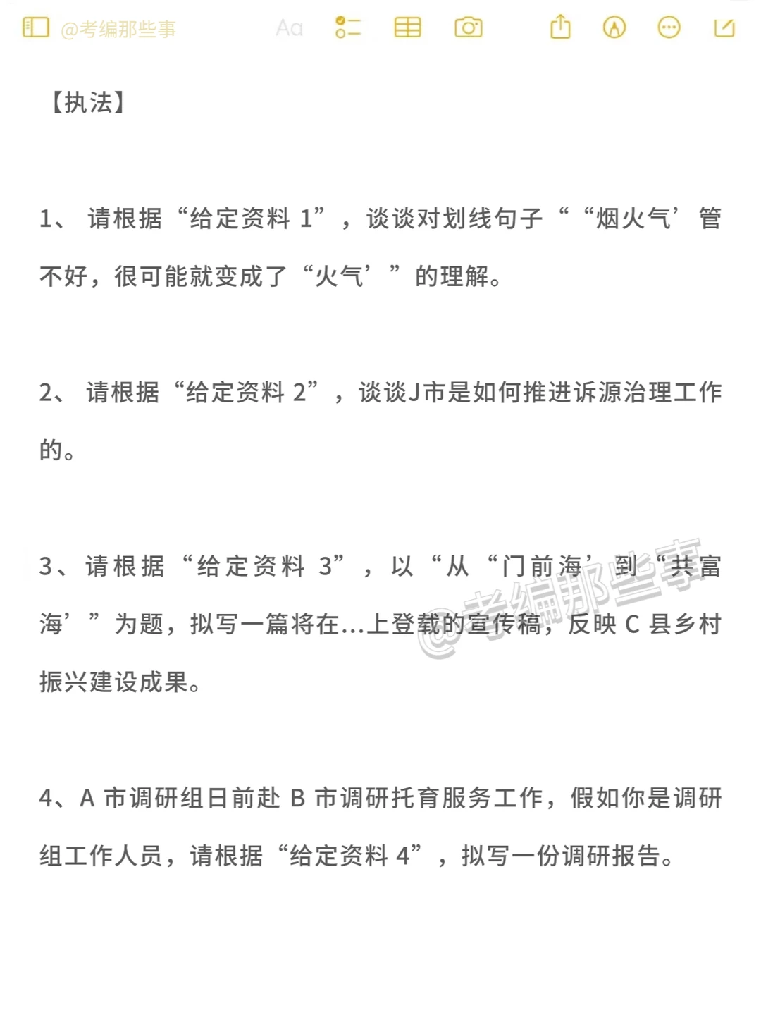 2024福建省考指南(如图) [喝奶茶R]申论(参考23) 【省市】 题量:4题 主题:乡村振兴、社区治理 题型:做法+解释型+问题及建议+大作文 【县乡】 题量:4题 主题:高质量发展 题型:做法+问题及措施+倡议书+讲话稿 【执法】 题量:4题 主题:依法行政和规范执法 题型:解释型+做法+宣传稿+调研报告