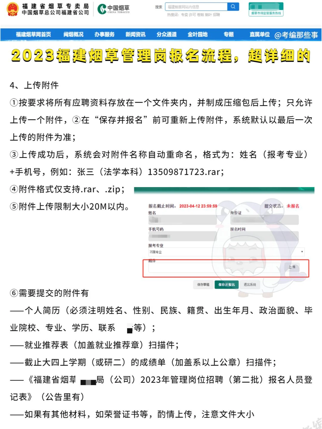 ①按要求将所有应聘资料存放在一个文件夹内,并制成压缩包后上传;只允许上传一个附件,②在“保存并报名”前可重新上传附件,系统默认以最后一次上传的附件为准;