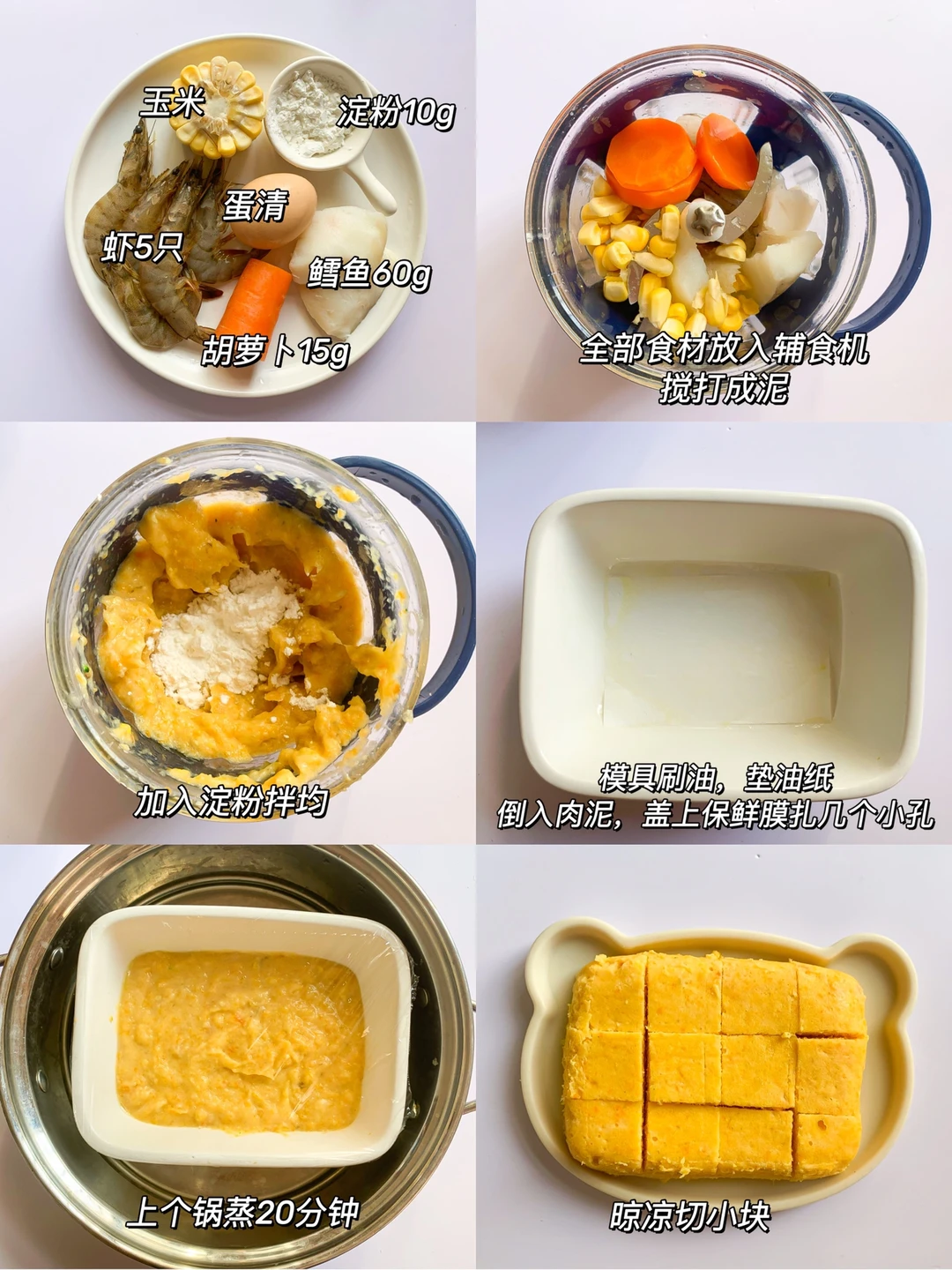 1⃣️虾、鳕鱼、胡萝卜、玉米和蛋清放入辅食机搅打成泥,加入淀粉拌均匀