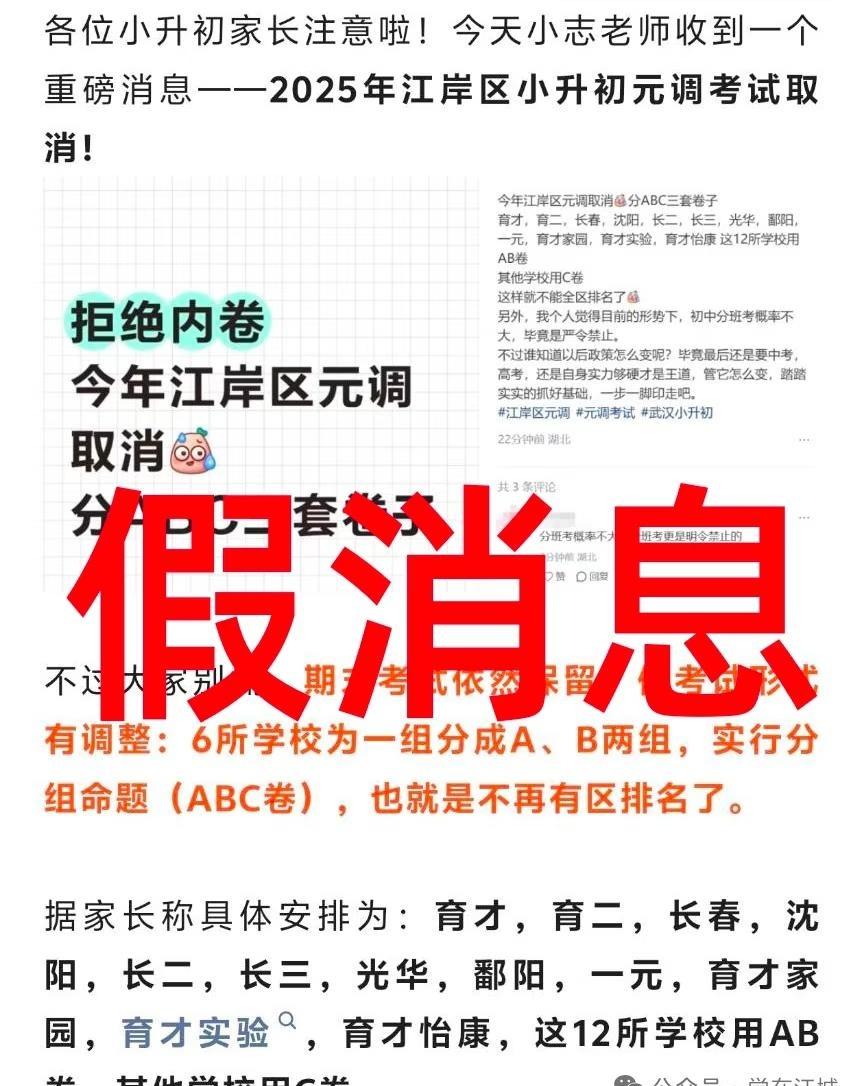 紧急辟谣!2025江岸区元调取消是假消息! 今日上午多平台多账号发布关于武汉小升初元调取消的信息。 后经过官方辟谣,小学六年级只有期末考试,从来就没有“元调”,更不存在取消一说。 今年三至六年级期末时间也已经确定了,就在1月27号,所以大家可以继续安心备考,迎战期末!江岸区元调江岸区元调取消