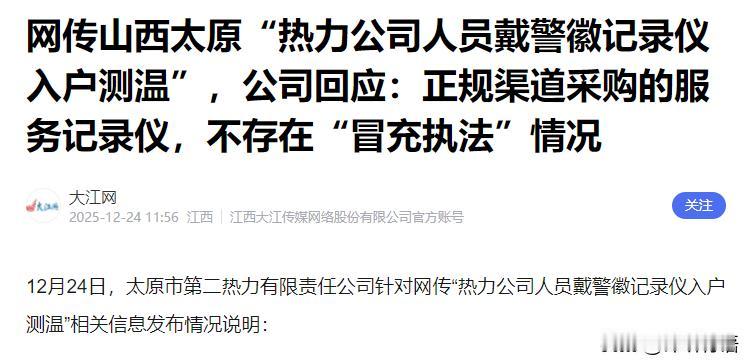 这下闹大了!近日报道,山西太原,男子家里温度低于18度,就向热力公司投诉,没想到,工作人员偏偏等到中午上门,而且专测阳面的房子,正当男子提出质疑时,他又发现了另外一个问题,上门的工作人员佩戴的记录仪上面还印有警徽,男子不表示无法理解。 事情的主角是太原晋源区太药A区的一位住户,他家自从十多年前从单位自供暖改成集中供暖后,冬天家里就没真正热过,这成了他的一块心病。 他家房子有140平方米,只有一个卧室和带小窗户的客厅是阳面,其余两个卧室都是阴面,每到冬天,阴面房间温度常常只有十几度,即便是今年10月中旬太原提前启动供暖,12月22日室外气温5℃的时候,他家的温度也只有17.5℃,明显没达到当地规定的18±2℃供暖标准。 为了能解决供暖问题,住户今年几乎每周都会向热力公司投诉,终于在12月下旬等来了太原第二热力有限责任公司的工作人员。 可上门的四五名工作人员,既没穿印着企业名字或标志的统一工服,也没主动出示工作证件,进门时还没穿鞋套,直接踩着灰尘走进了屋里。 更让住户在意的是,工作人员选择上门的时间正好是中午太阳直射的时段,这个时候阳面房间的温度本就会因为阳光照射自然升高。 测温过程中,工作人员也完全没顾及住户反映的阴面房间低温问题,径直走到阳面客厅进行测量,测出20多度的温度后,就要求住户签字确认供暖达标。 住户当场提出质疑,认为只测中午的阳面房间,根本反映不出家里日常的真实供暖情况,随后他又提出要检测供暖的进出水温度,这个能直接判断供热是否充足的关键要求,却被工作人员直接拒绝。 正当双方就测温问题产生分歧时,住户突然发现,其中一名工作人员胸前佩戴的记录仪上,清晰印着警徽标志。 这一发现让住户更加无法理解,他知道警徽是人民警察的专用标志,热力公司作为提供供暖服务的企业,又不是执法部门,怎么会使用带有警徽的记录仪? 住户当即就向工作人员询问记录仪的来源,可对方始终闭口不谈,只是反复强调自己是热力公司的工作人员。 事实上,这已经不是住户第一次遇到携带带警徽记录仪的热力公司工作人员了。 他之前就曾在11月7日下午,拍到过热力公司工作人员佩戴带有警徽的记录仪上门的照片,当时工作人员穿的是蓝色外衣,而12月18日下午上门的工作人员穿的是灰色外衣,佩戴的记录仪同样带有警徽。 住户后来通过查询比对确认,这两次工作人员佩戴的记录仪都是海康威视DSJ-HIKB1A1型,这款型号的记录仪多被各地公安系统集中采购。 带着对警徽记录仪的疑惑,住户先向辖区的义井派出所反映了情况,可最初派出所民警表示,对方没有自称公安干警,只是记录仪有警徽,并不构成违法,还说市面上很多零售的执法记录仪都有警徽,这类设备不属于警用器械。 民警还提到,执法记录仪是近几年才出现的,相关法律相对滞后,没有明确条款禁止非公安系统的单位和个人使用警徽。 随后有媒体记者就此事以咨询者身份致电义井派出所,明确指出《人民警察警徽使用管理规定》和《人民警察法》中都有明确要求,警徽是人民警察的专用标志,其他单位和个人不得持有、使用、制造、仿造、伪造和买卖。 面对明确的法律依据,民警承认此前的说法存在疏漏,表示会联系热力公司约谈相关负责人。 媒体记者也曾多次联系太原第二热力有限责任公司,就工作人员着装、持证要求、测温时段规范以及记录仪带警徽等问题进行询问,客服人员均未直接答复,仅留下联系方式表示会反馈相关部门,但截至12月24日,仍未给出明确回应。 12月24日,太原第二热力有限责任公司针对此事发布了情况说明。说明中提到,网传带有警徽的记录仪,实际是公司通过正规渠道采购的服务记录仪,仅用于客观记录入户服务全过程,保障服务双方的合法权益,规范服务流程,绝非执法设备,不存在“冒充执法”的情况,公司已建立设备使用管理规范,记录数据会严格按规定存储保管。 关于住户家的供热情况,热力公司表示,经核实,住户所在楼栋是老旧小区,原设计的采暖方式是挂暖,而该住户家中自行改为了地暖,公司工作人员和社区工作人员曾多次上门检测,测出住户家中温度均达20℃以上。 12月23日,公司还随机对该小区三户用户入户测温,平均室温都在25℃以上,小区的进水、回水温度也均达标。 热力公司还提到,此前曾多次主动联系住户,想上门回访检查并提供技术指导,但都遭到拒绝,后续会继续主动与住户联系,提供地暖系统适配性技术建议,协助排查供热问题…… 对于这件事,你有什么看法呢?欢迎在评论区留言讨论!