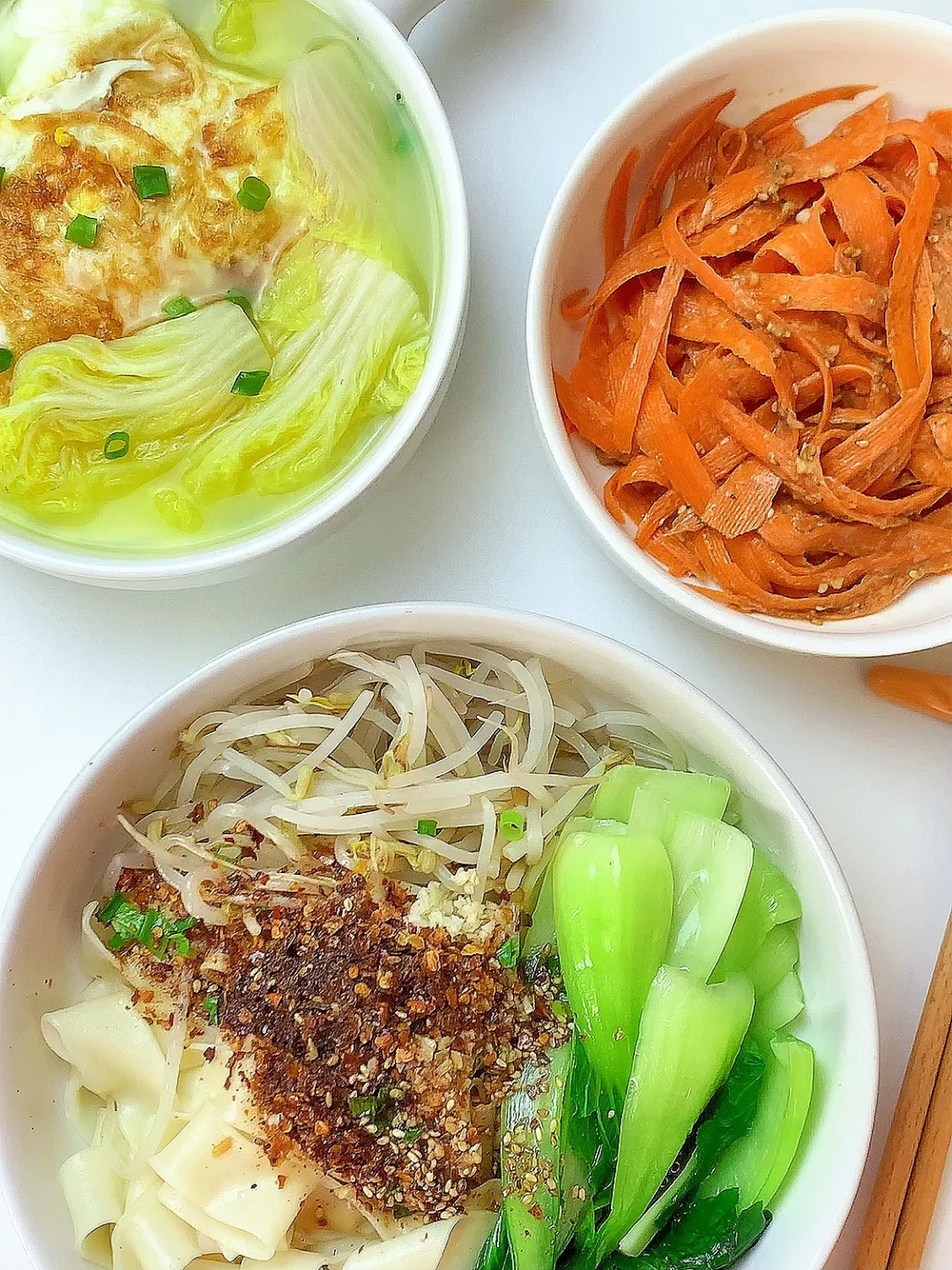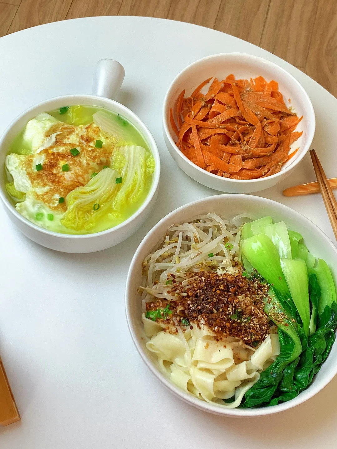 👩🏻🍳分享晚餐菜单 1️⃣娃娃菜煎蛋汤 2️⃣芝麻胡萝卜 主食:油泼面🍜 ……………………………………………………………………………… 🛒食材清单: 鸡蛋 | 娃娃菜 | 胡萝卜🥕 | 青菜🥬 | 豆芽 | 面条 📝早八打工人的一日三餐,拒绝外卖[偷笑R],坚持做饭的又一天,吃简单干净的饭菜~ ₍˄·͈༝·͈˄*₎◞ ̑̑