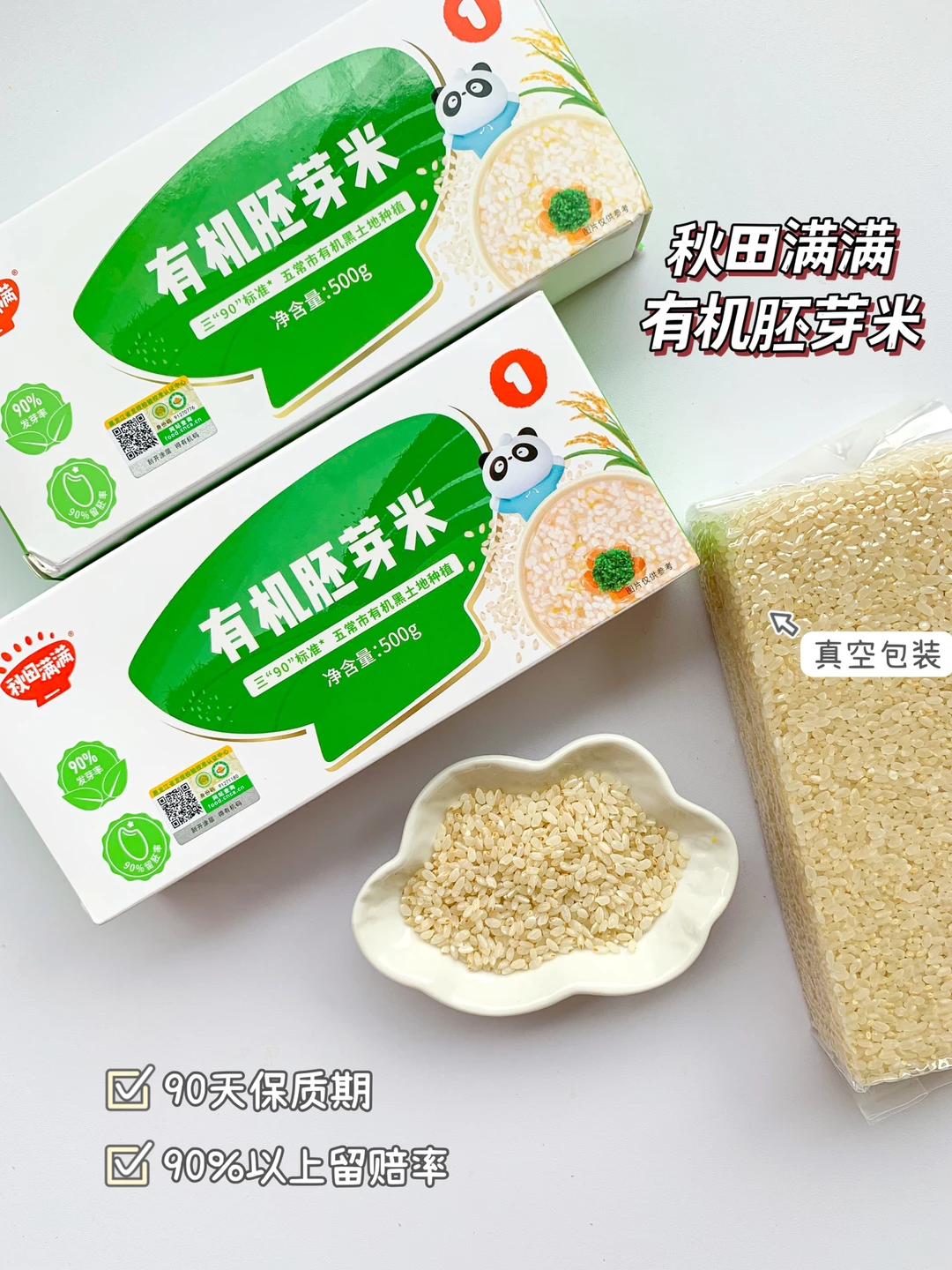 🌈我用的是秋田满满有机胚芽米,胚芽是大米的精华,这款真的能看见好多的胚芽,毕竟94%的留胚率,90天的保质期,煮完之后口感也是软糯香甜的,宝宝很喜欢吃~