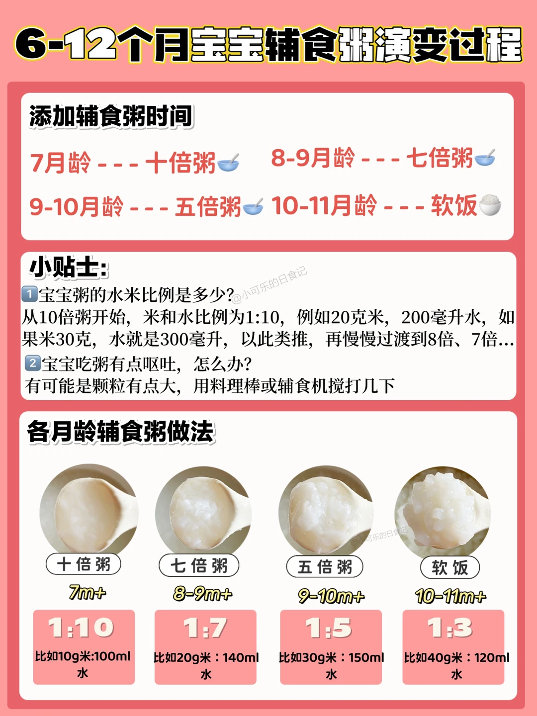 7月龄(十倍粥)➡️8-9月龄(七倍粥)➡️9-10月龄(五倍粥)➡️10-11月龄(软饭)