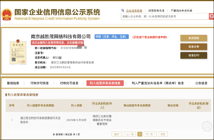 12月26日,记者调查发现,涉事App开发公司已被市场监管部门列入经营异常名录。记者以市民身份致电该公司辖区南京江北新区管理委员会市场监督管理局问询,一名工作人员解释称,企业被列入经营异常,说明执法人员在注册地址无法找到该公司,且无法取得联系。“3500元借款10天需还4970元,明显涉嫌高利贷,建议向金融管理部门反映。”