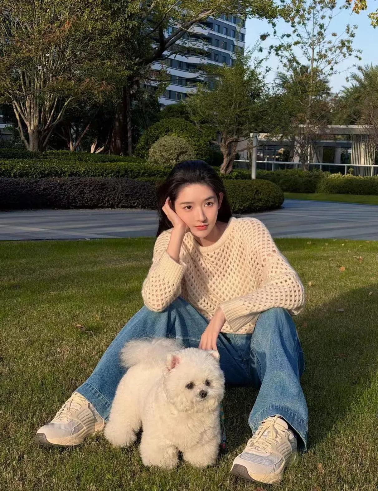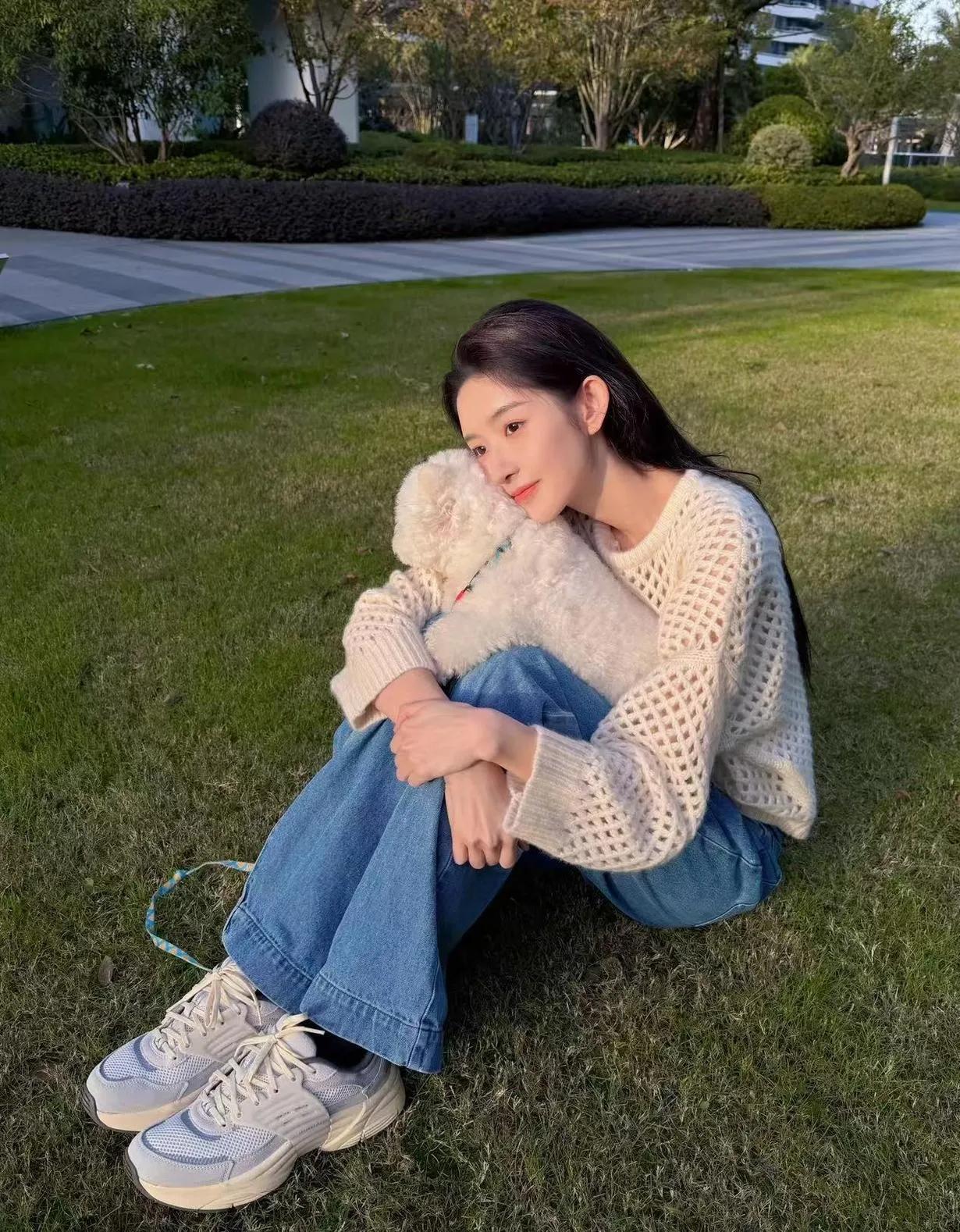 王玉雯的简约私服,慵懒清新太好看 王玉雯这组私服绝了!米白镂空毛衣搭蓝色阔腿裤,基础款穿出满满的少女感,和小比熊同框的画面更是清新又治愈,简约穿搭的氛围感直接拉满~