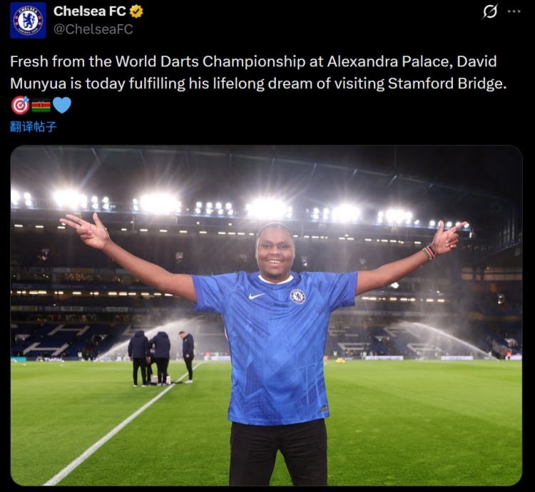 切尔西官推也晒出了大卫·穆纽亚的照片,并表示:“刚刚结束世界飞镖锦标赛的大卫·穆纽亚,今天实现了他毕生的梦想——参观斯坦福桥球场。”