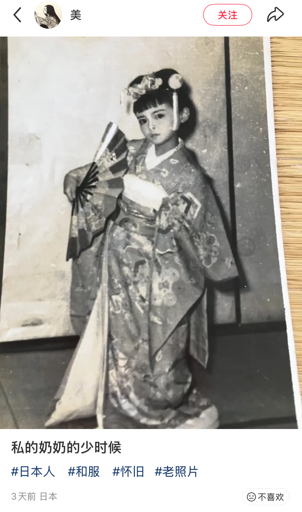 在中日关系尤为紧张的时刻,一个日本女孩在小红书发布了一张奶奶年轻时的和服写真,并搭配了一句塑料中文“私的奶奶的少时候”。