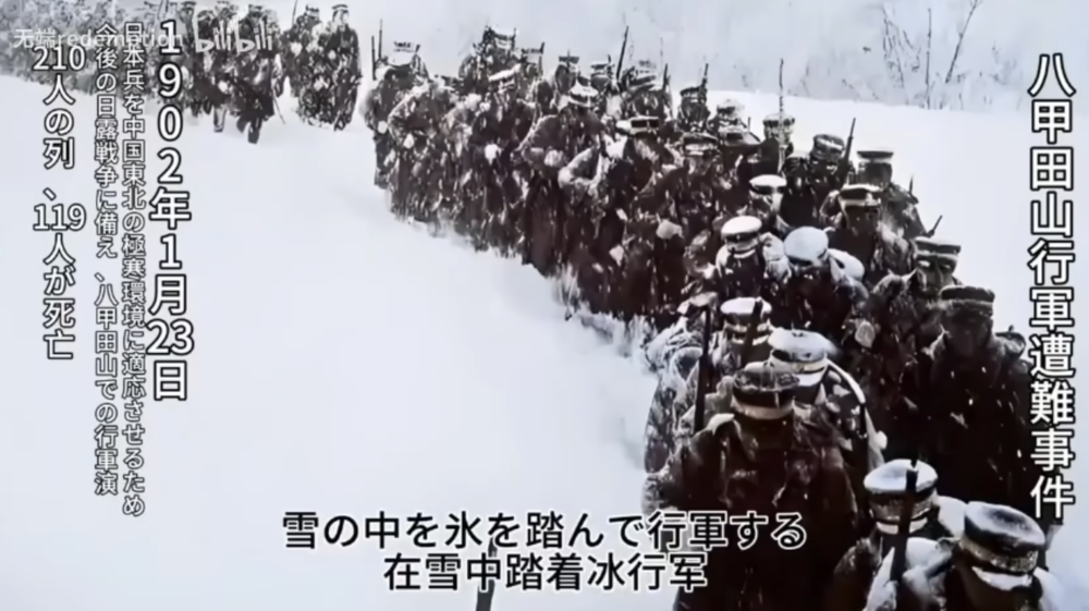 这首被刷屏的军歌叫做《雪の進軍》,创作于1895年,其歌词描写的是日军在冬季严寒中行军的艰苦场景,旋律很悠扬婉转,但歌词非常残酷,常被B站用户拿来揶揄1902年的“八甲田山死亡行军遇难事件”——