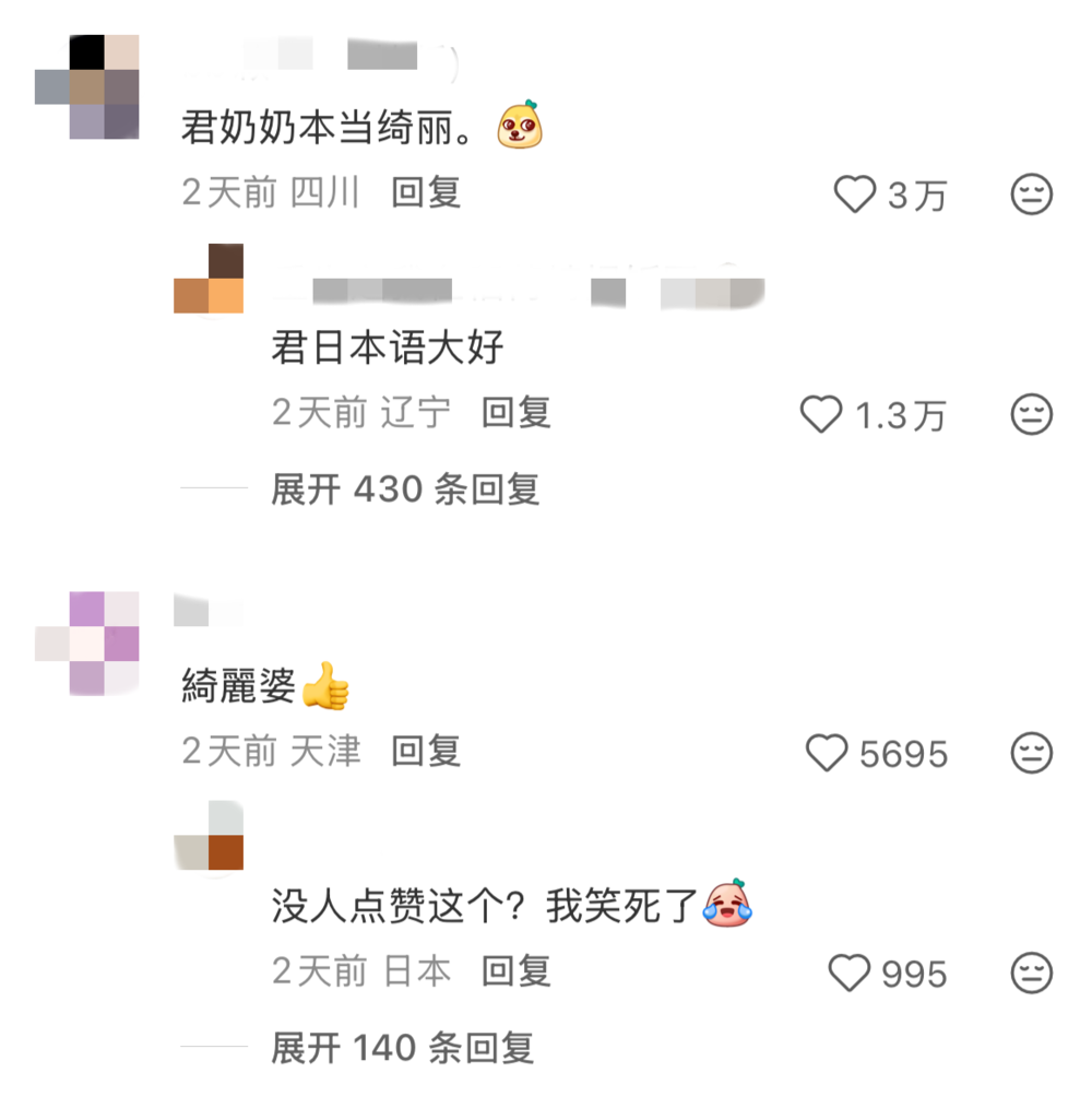 中国网友的塑料日语占领了评论区,大赞“君の奶奶本当绮丽”“绮丽婆”。即便语法全是错的,我们也想逗一逗海对岸的陌生人。
