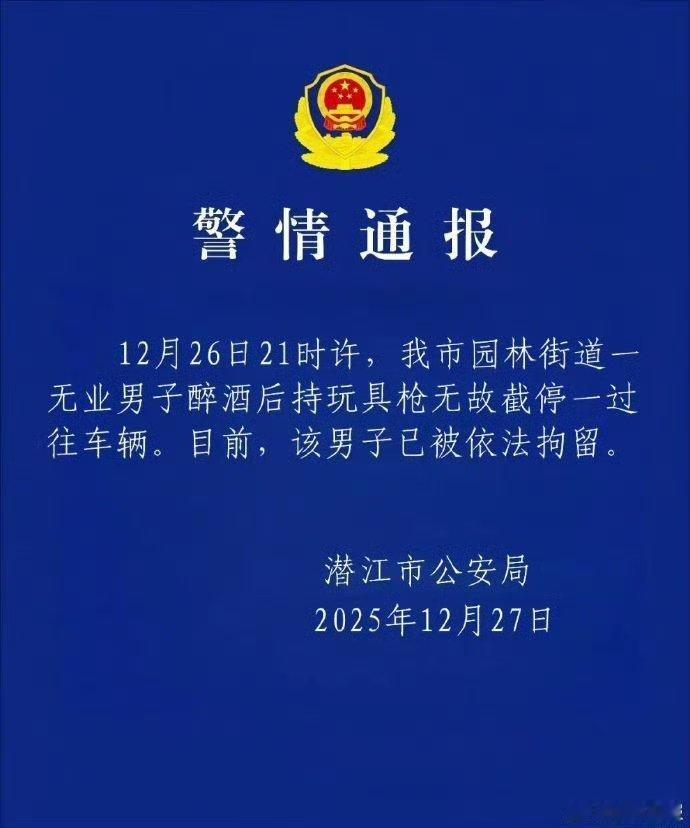警方通报醉酒男子持玩具枪截停车沁园春·戏题潜江醉汉醉里疏狂,手握“钢枪”,敢截路央。看斑马线上,黑衣张霸;车门框畔,浊语颠唐。玩具充锋,虚声恫吓,妄作英雄模样扬。街灯下,惹车流顿滞,夜色惶惶。堪怜醒后方慌,知铁窗滋味忒难当。笑三杯猫尿,销磨理智;一身乖戾,触犯宪章。自古狂徒,皆因酒误,徒把荒唐换罚章。君记取,莫贪杯逞勇,惹祸招殃。警方通报醉酒男子持玩具枪截停车