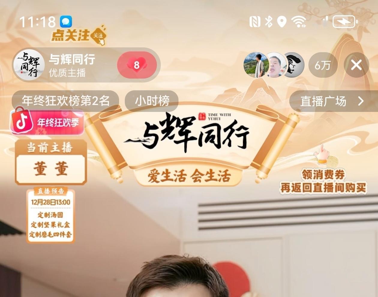 谁能想到啊, 宇辉不上播的时候, 晚上十一点多了直播间还有6万加的人气, 直到下播的时候。 还有四万人陪着主播下班。 人家老板带着一遛人马逛小吃街, 也只有1.5万人,[大笑] 这人气是有那么一丁点气人。 说起来还是要感谢“喷子”们, 这几天不是鱼丸就是拿茶叶说事, 简直不让热度落地, 与辉同行天天被人讨论, 所以这人气想差都难。 这几天没报与辉同行业绩, 不是不知道, 而是各种考量太多, 树大招风, 怕业绩太好让人嫉恨。 很多朋友都私信我, 想问问与辉同行这几天销量怎样, 那我就今天把这几天的数据报一下吧。 25号,与辉同行跑了1.16亿步, 结交了新朋友7万。 26号,跑了9千万步, 交了新朋友6万。 27号,跑了8100万步, 交了5万个新朋友。 呵呵呵, 每天都有几万的新朋友加入, 与辉同行在向3800万努力, 而有些人家一直在打2800保卫战。 不能进步保证不后退也是不错的, 值得为2800万点赞! 散会! 董宇辉