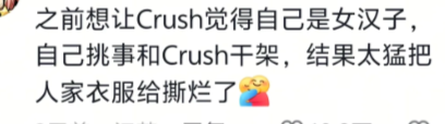 之前想让Crush觉得自己是女汉子,自己挑事和Crush干架,结果太猛把人家衣服给撕烂了