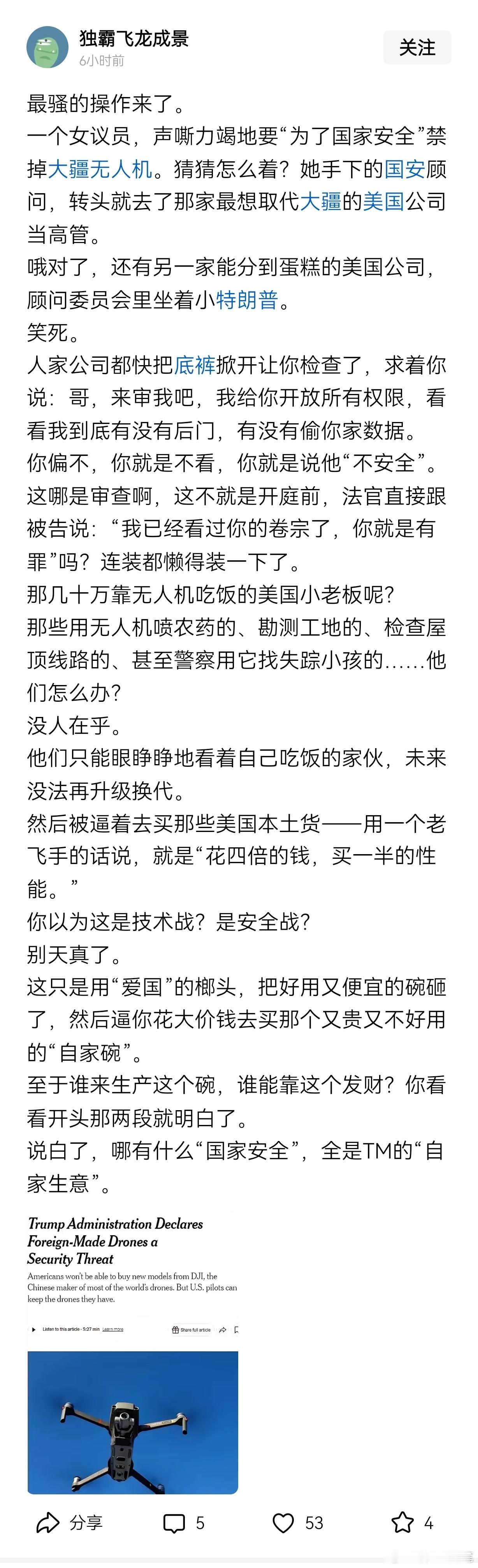 一个女议员,声嘶力竭地要“为了国家安全”禁掉大疆无人机。猜猜怎么着?她手下的国安顾问,转头就去了那家最想取代大疆的美国公司当高管。哦对了,还有另一家能分到蛋糕的美国公司,顾问委员会里坐着小特朗普。殖人快来说,美国没有腐败,美国没有搞“爱国贼”