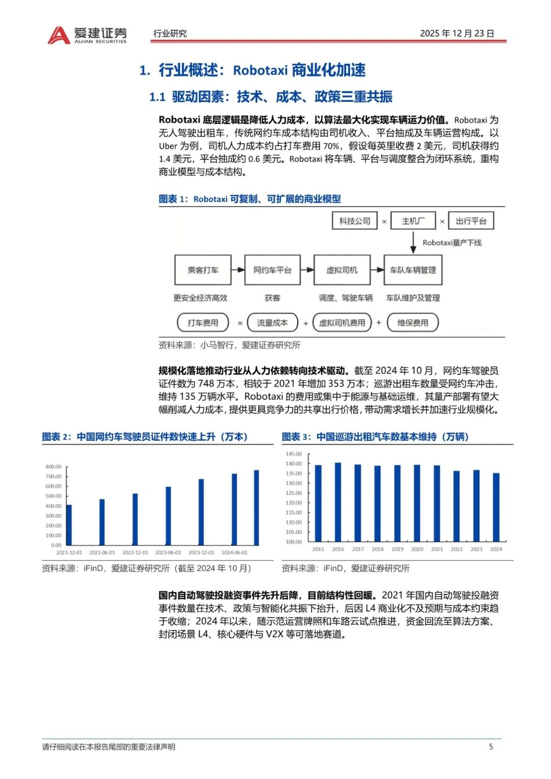 规模:2030年中国市场有望超过1500亿元。Robotaxi为无人驾驶出租车,其运营成本降低是商业化落地关键。我们测算,纯无人Robotaxi单公里成本有望降至0.55元,较传统燃油网约车下降72%,单车日均收入或达680元。展望2030年,中国Robotaxi保有量有望达40万辆,市场规模超1500亿元,其中打车服务841亿元、整车销售680亿元、广告及车载娱乐等增量收入约62亿元。