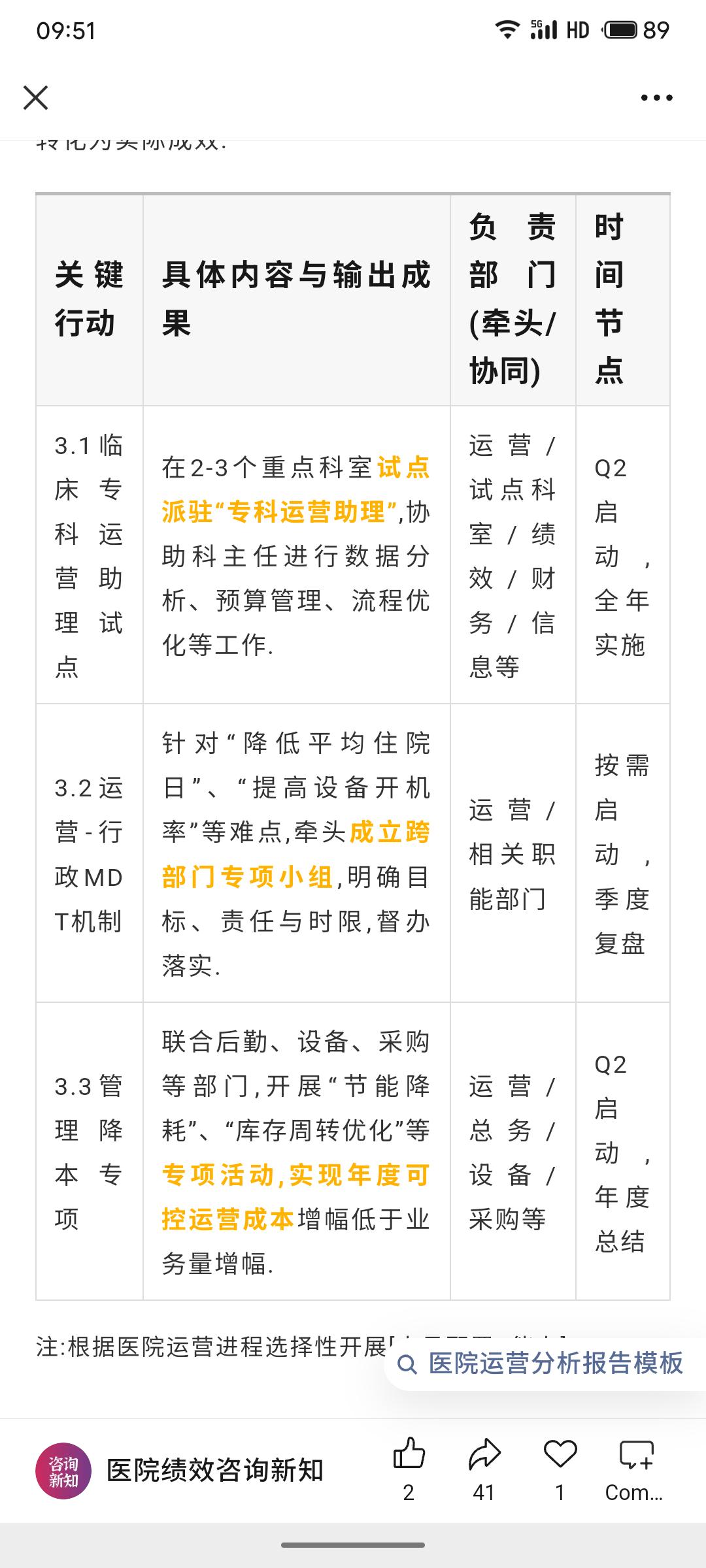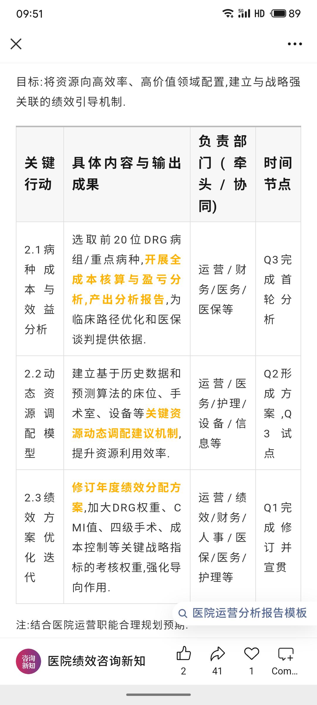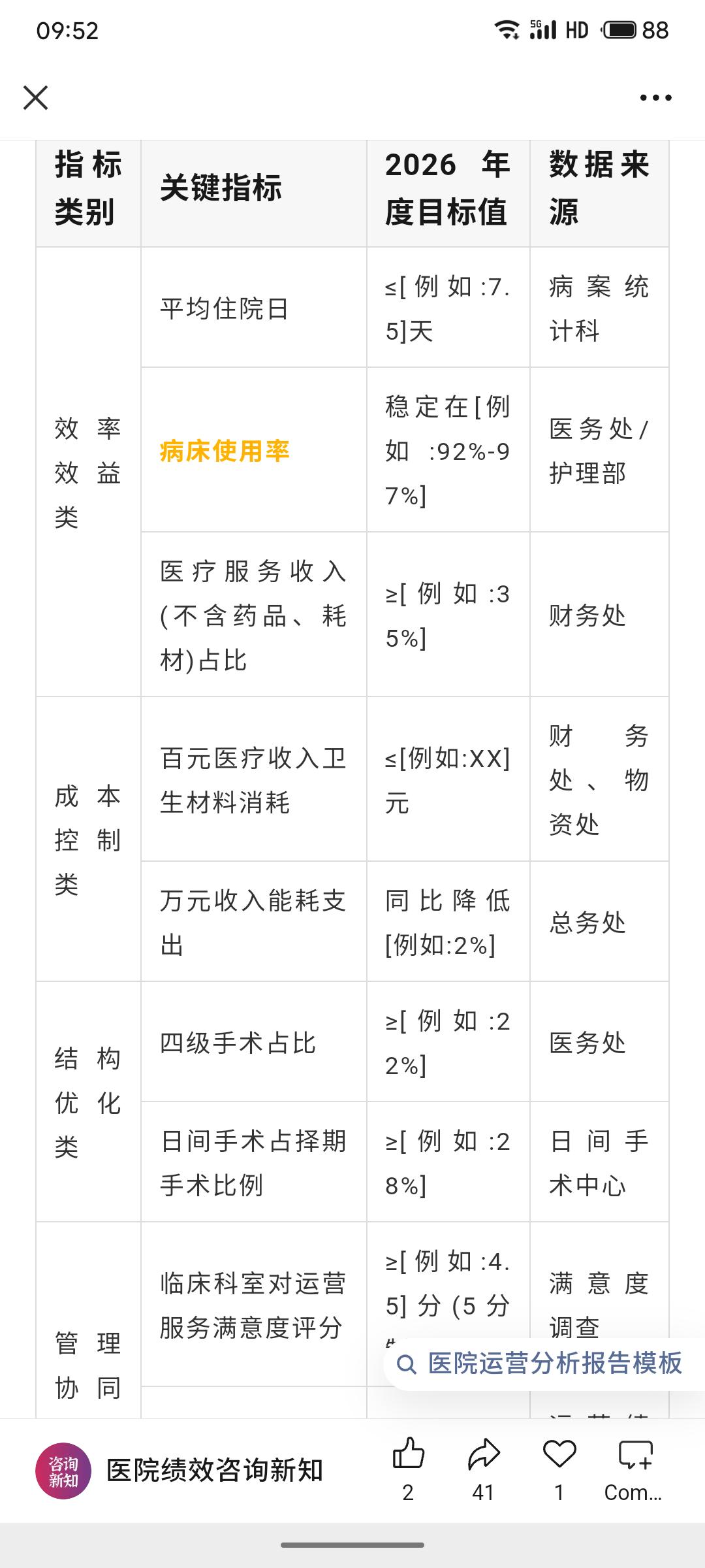 2026年度医院运营工作计划以“提质、增效、降耗、协同”为核心,围绕数据驱动、资源效能与流程协同三大支柱展开。通过建设运营数据中台、深化病种成本分析、推行专科运营助理试点等关键行动,推动精细化管理和业财融合。设立平均住院日、医疗服务收入占比等量化指标,并辅以组织、制度与技术保障,分季度推进目标解码、过程管控与复盘优化,全面支撑医院战略落地与高质量发展。