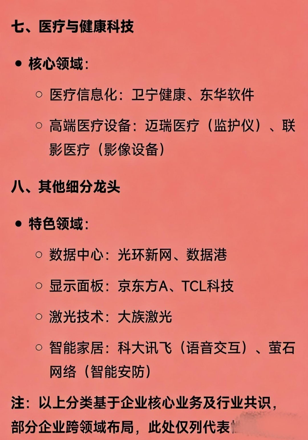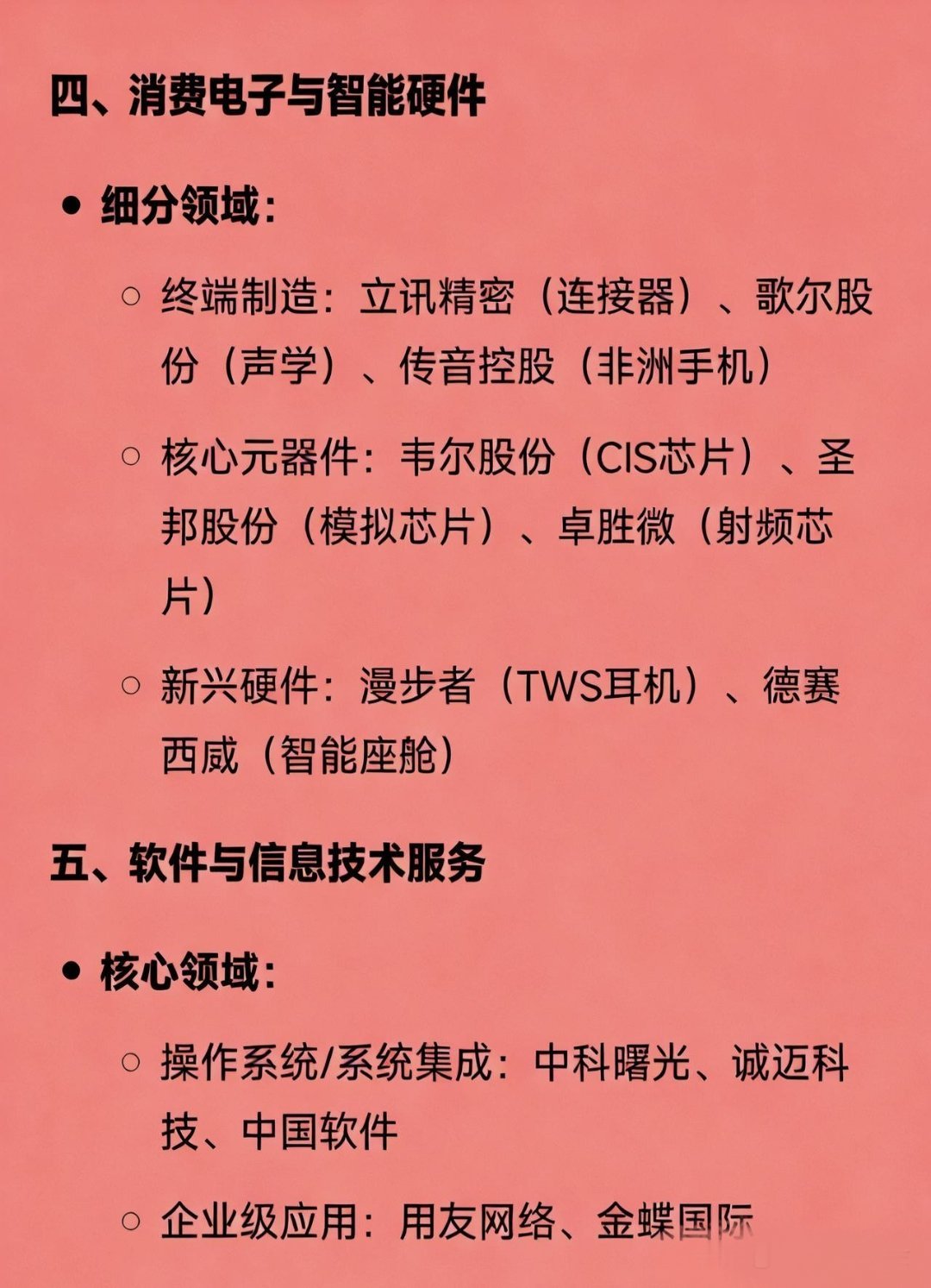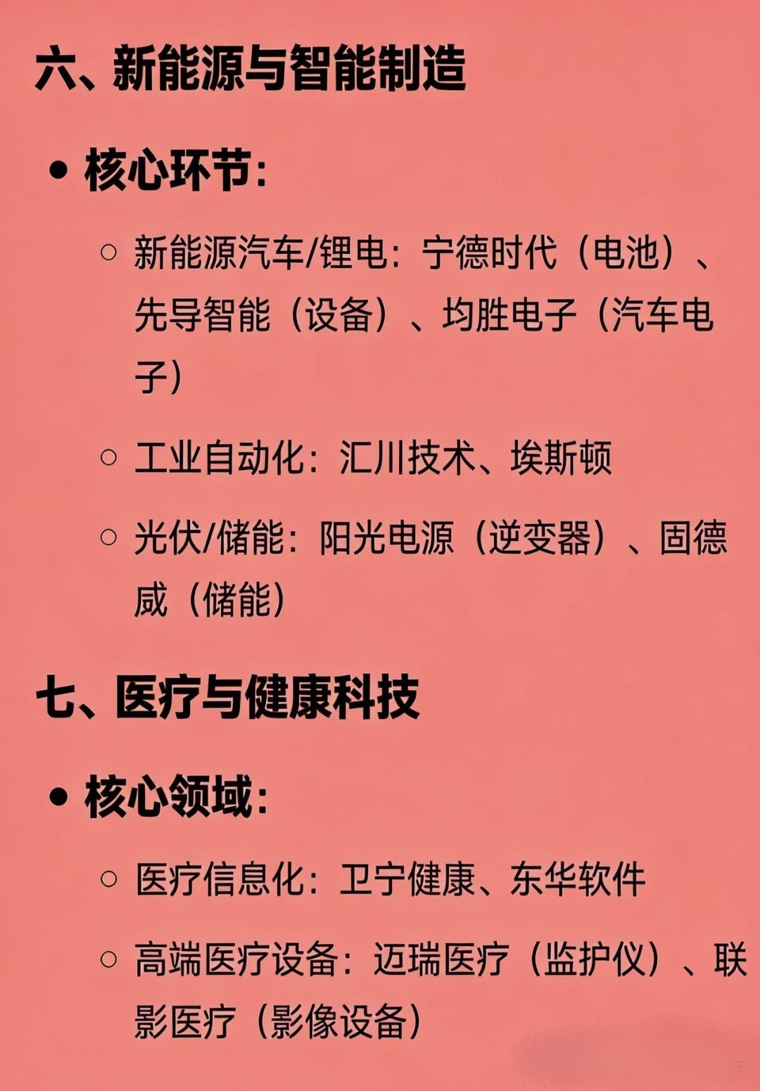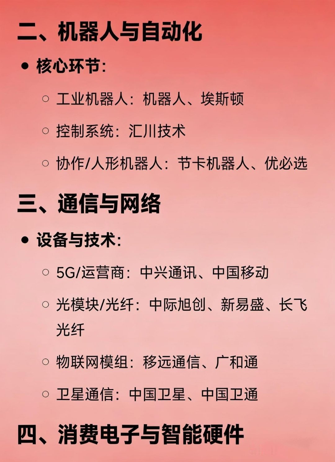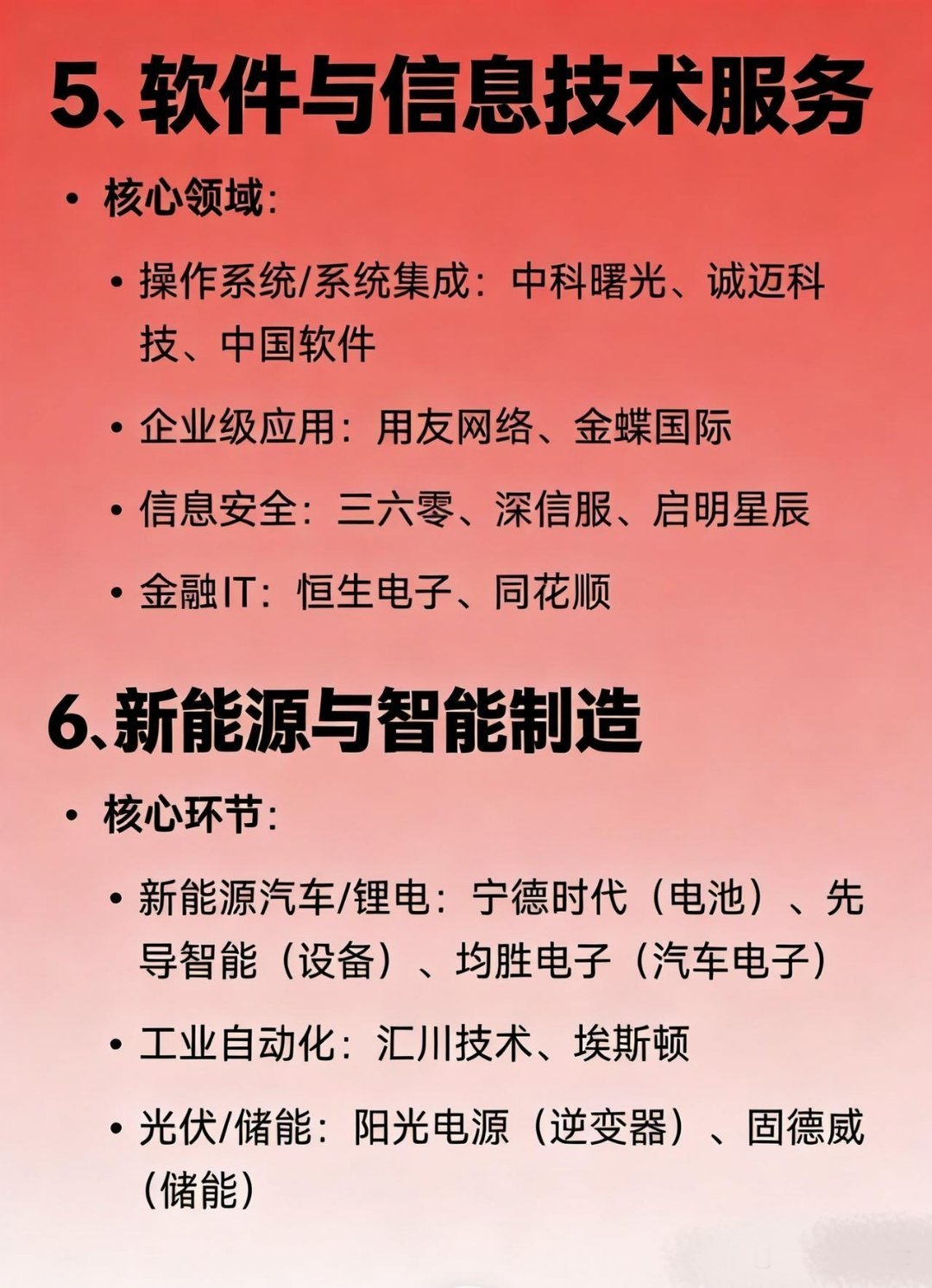 2025科技龙头100强一、半导体与集成电路全产业布局:中芯国际、长电科技、华天科技细分技术:刻蚀/晶圆制造:中微公司、晶盛机电存储/接口:兆易创新、澜起科技检测/设备:长川科技、芯源微材料:沪硅产业(硅片)、江化微(湿电子化学品)、有研新材(靶材)二、机器人与自动化核心环节:工业机器人:机器人、埃斯顿控制系统:汇川技术协作/人形机器人:节卡机器人、优必选三、通信与网络设备与技术:5G/运营商:中兴通讯、中国移动光模块/光纤:中际旭创、新易盛、长飞光纤物联网模组:移远通信、广和通卫星通信:中国卫星、中国卫通四、消费电子与智能硬件细分领域:终端制造:立讯精密(连接器)、歌尔股份(声学)、传音控股(非洲手机)核心元器件:韦尔股份(CIS芯片)、圣邦股份(模拟芯片)、卓胜微(射频芯片)新兴硬件:漫步者(TWS耳机)、德赛西威(智能座舱)五、软件与信息技术服务核心领域:操作系统/系统集成:中科曙光、诚迈科技、中国软件企业级应用:用友网络、金蝶国际信息安全:三六零、深信服、启明星辰金融IT:恒生电子、同花顺六、新能源与智能制造核心环节:新能源汽车/锂电:宁德时代(电池)、先导智能(设备)、均胜电子(汽车电子)工业自动化:汇川技术、埃斯顿光伏/储能:阳光电源(逆变器)、固德威(储能)七、医疗与健康科技核心领域:医疗信息化:卫宁健康、东华软件高端医疗设备:迈瑞医疗(监护仪)、联影医疗(影像设备)八、其他细分龙头特色领域:数据中心:光环新网、数据港显示面板:京东方A、TCL科技激光技术:大族激光智能家居:科大讯飞(语音交互)、萤石网络(智能安防)