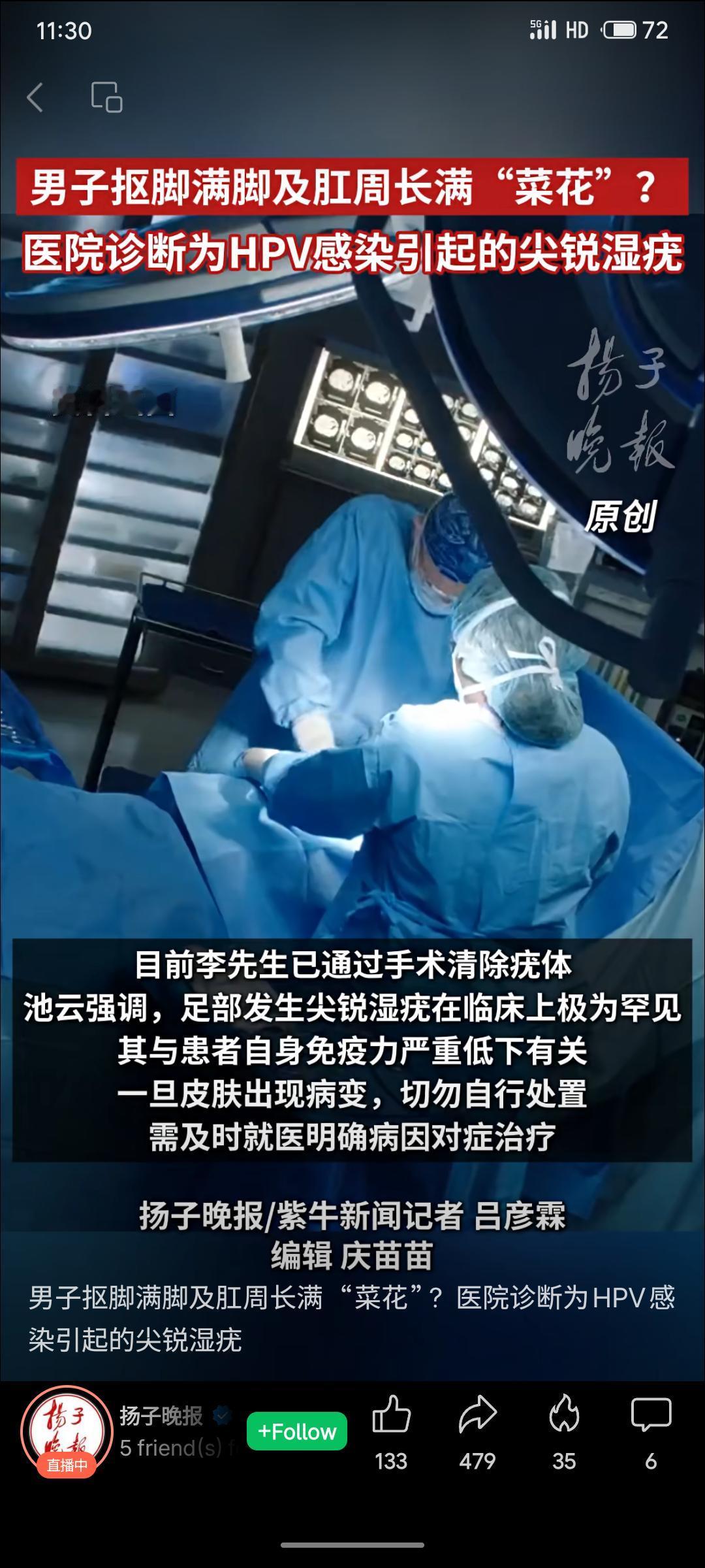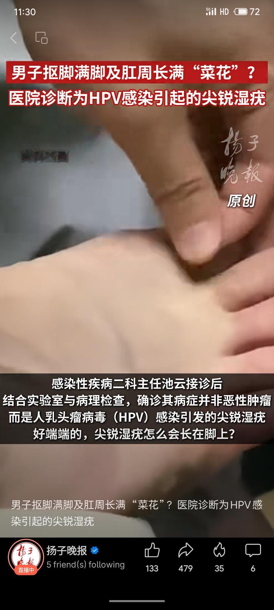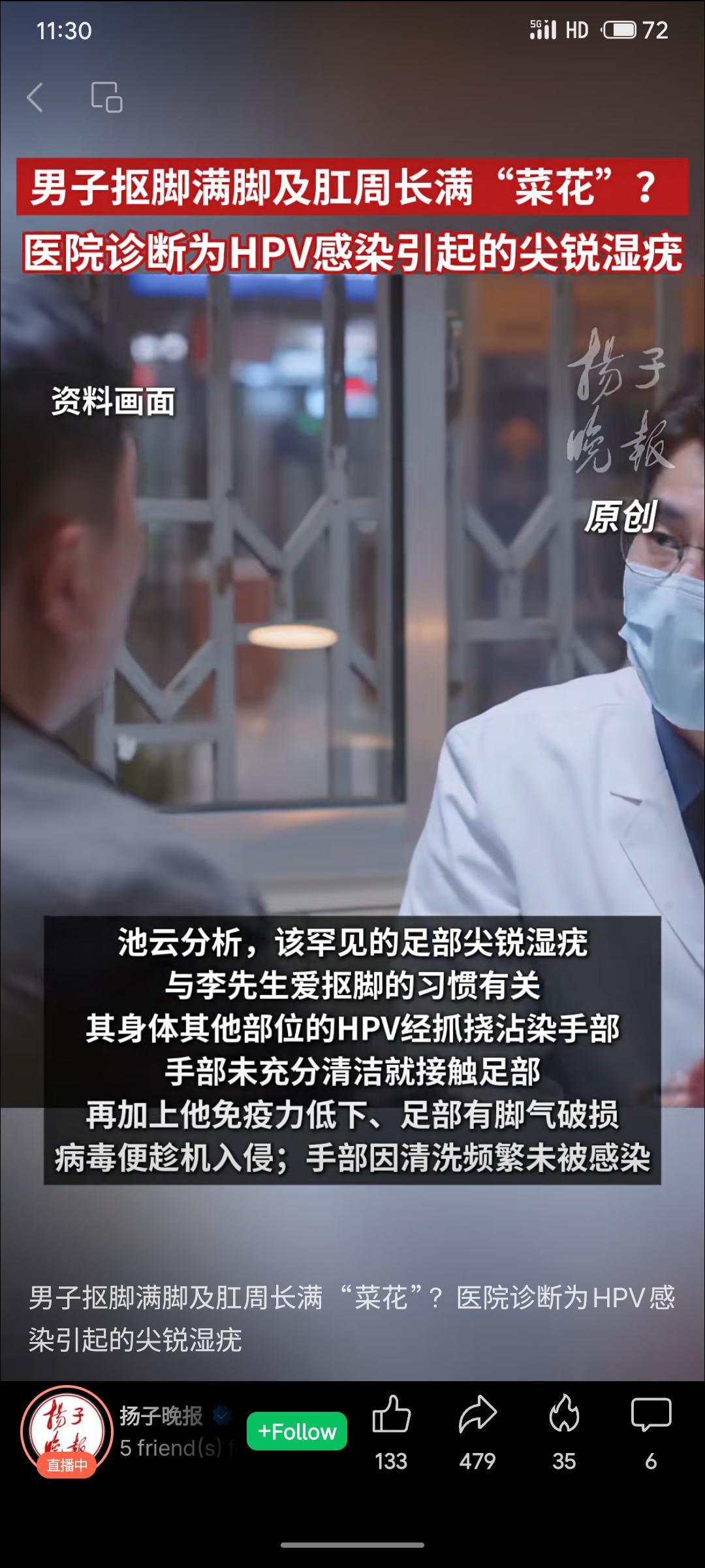 李先生因脚部水疱瘙痒,抠破后伤口处长出“菜花”状疣体,并蔓延至足部及肛周。经医院诊断,其病症为HPV感染引发的尖锐湿疣。医生分析,该罕见情况与其常抠脚的习惯有关:身体其他部位的HPV病毒经手部沾染至足部破损皮肤,加之免疫力低下,导致感染扩散。目前患者已手术清除疣体。医生提醒,皮肤出现异常病变应及早就医,切勿自行处理。