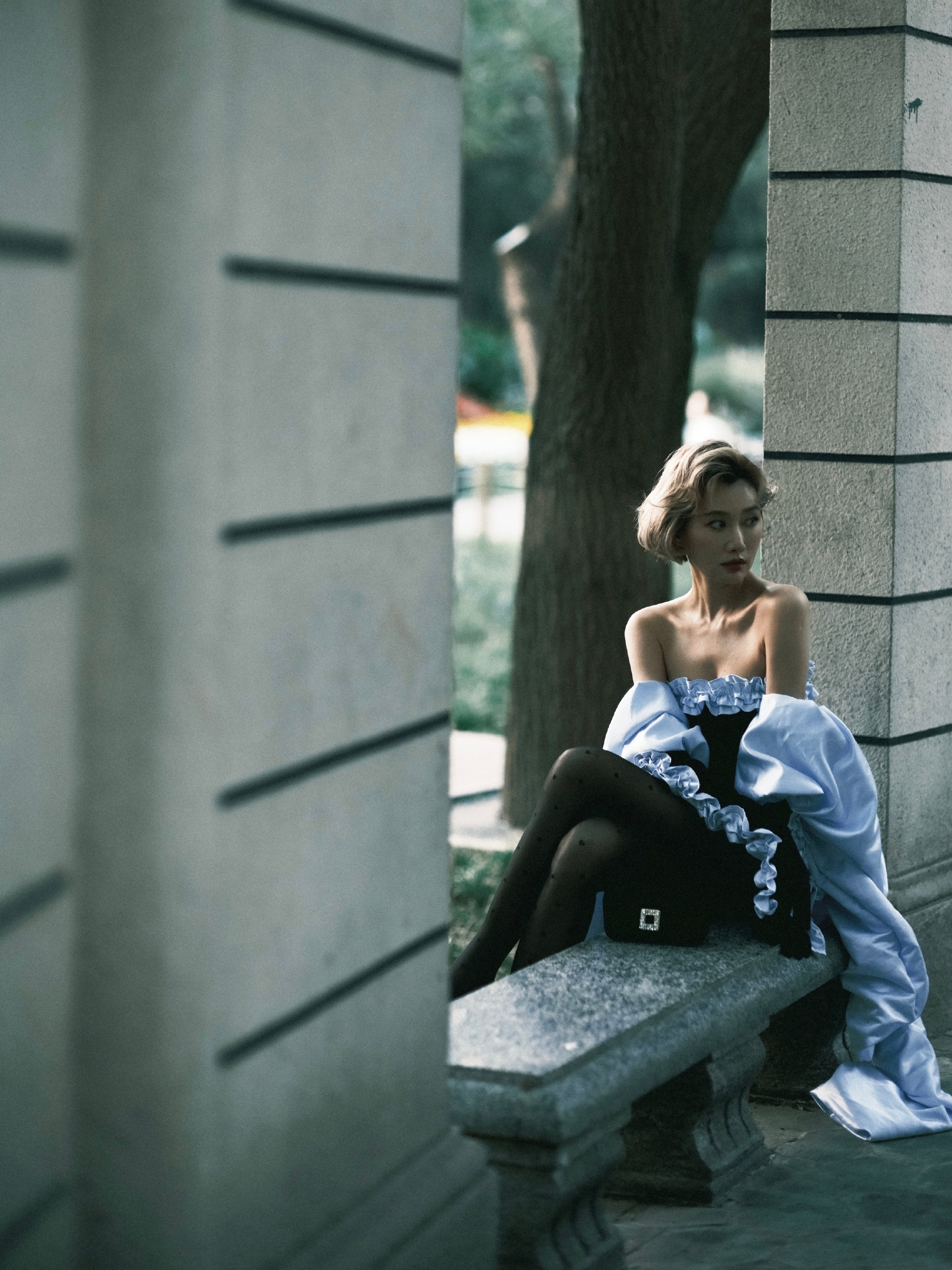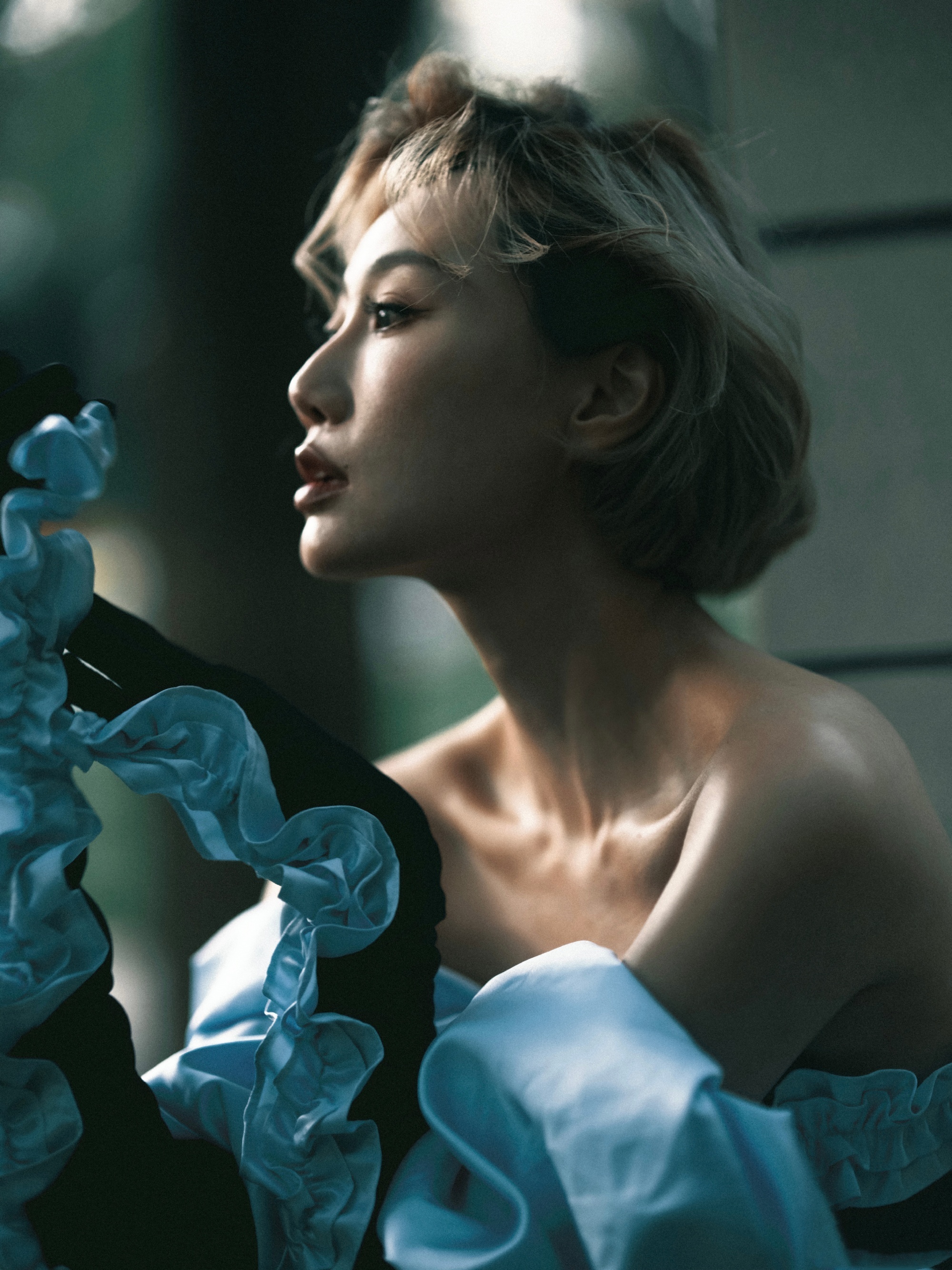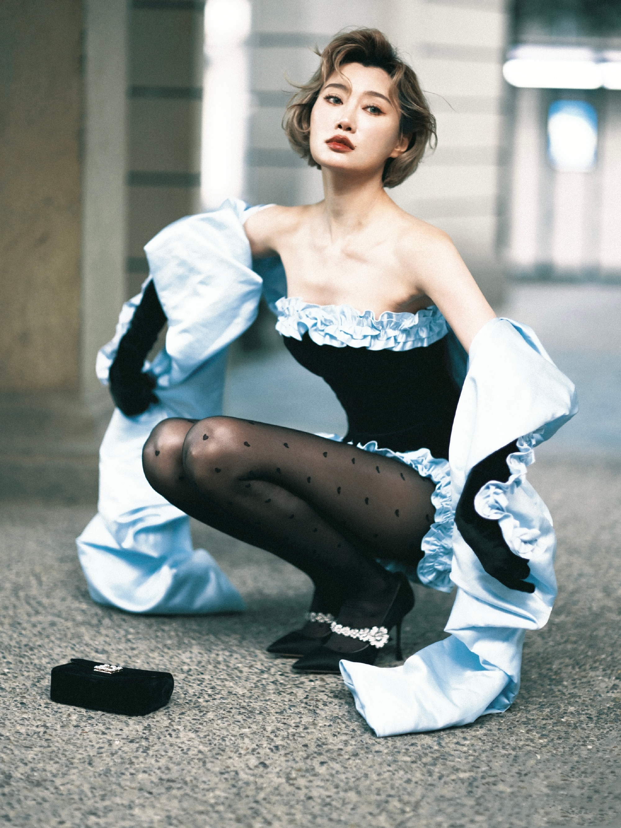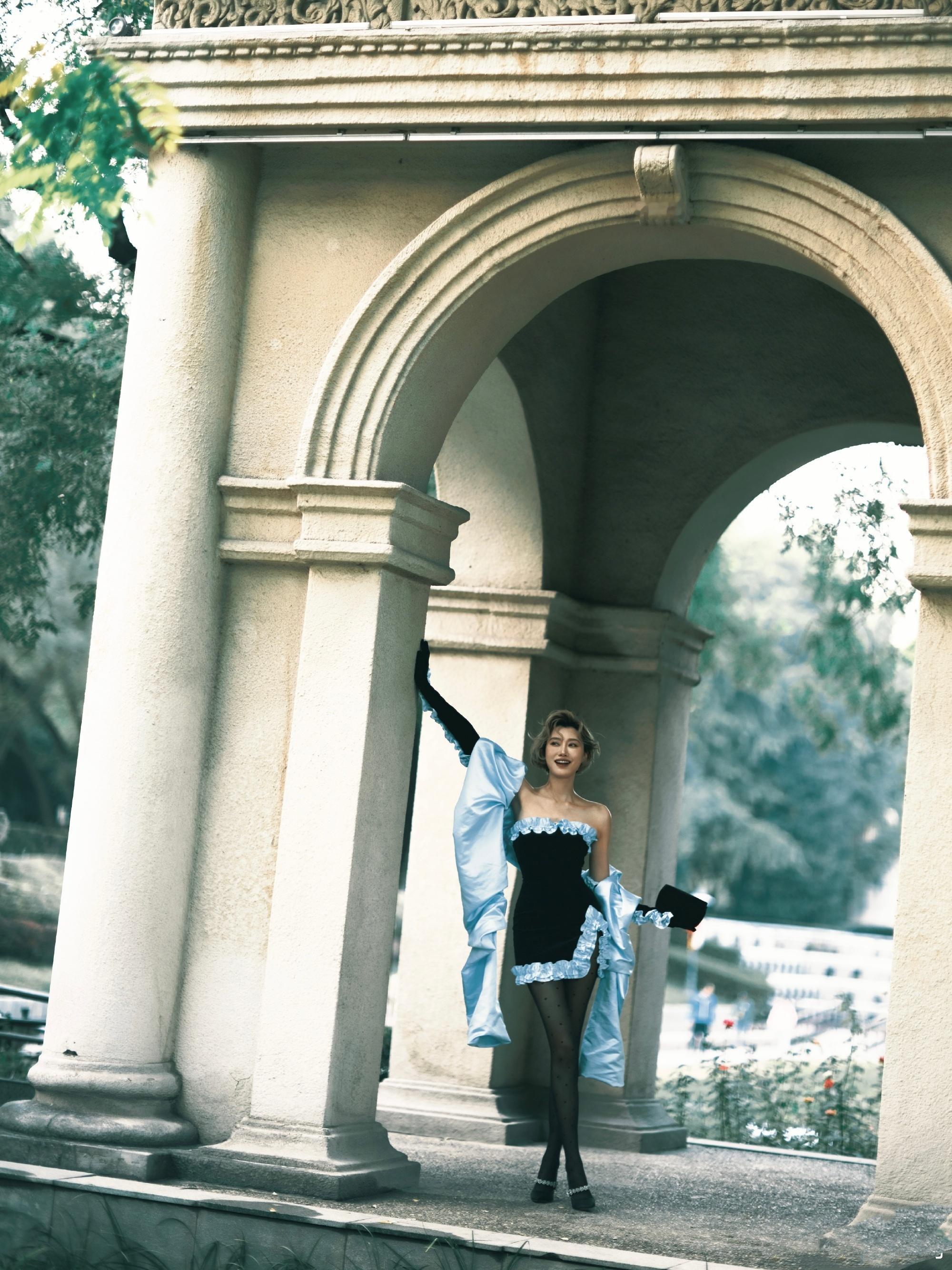 陈紫函身姿曼妙,一袭珠饰礼裙勾勒出玲珑曲线,在柔美白绒与镜面光影间,每一处线条