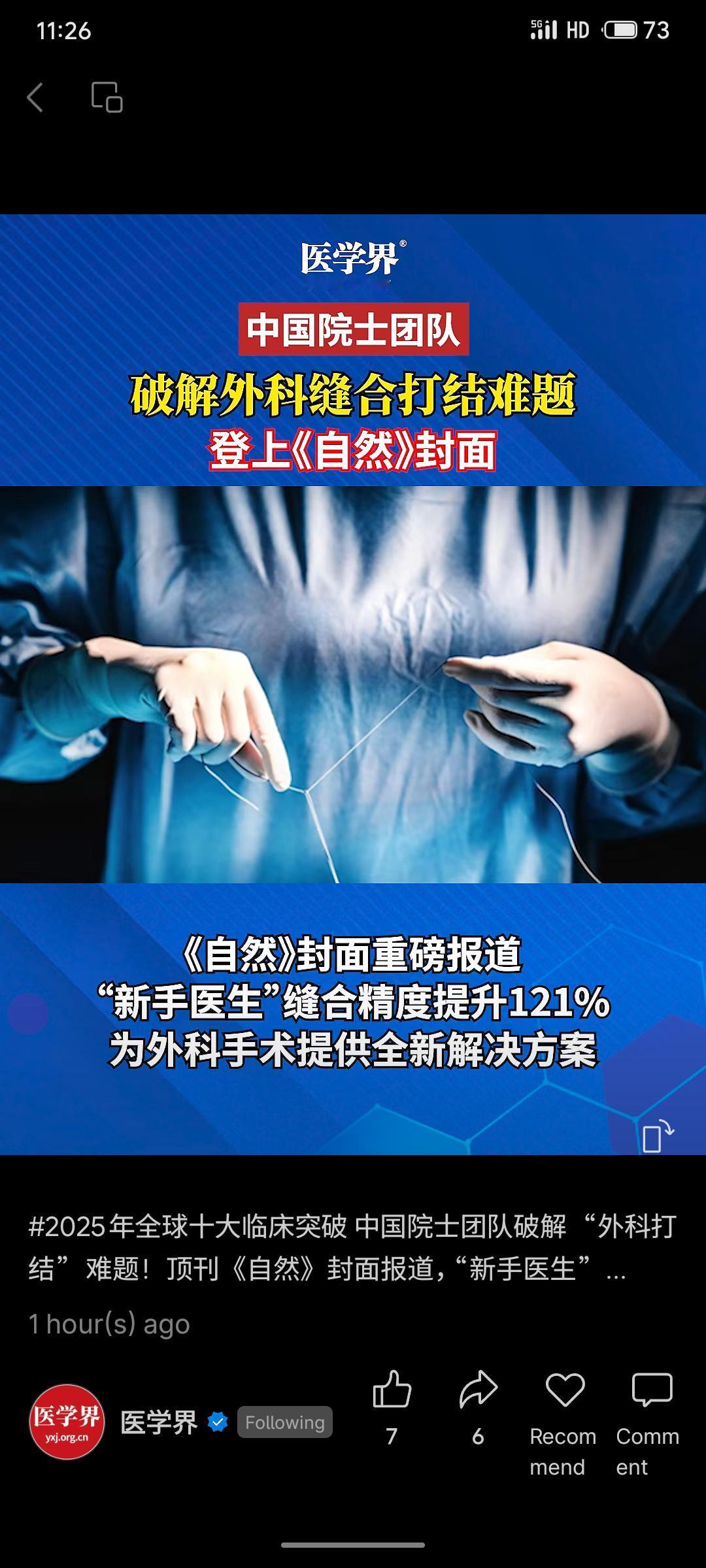 中国工程院院士团队研发出“活结智能缝线”,巧妙利用力学结构替代复杂传感器,成功破解外科缝合打结松紧度难以精准控制的百年难题。该成果登上顶级期刊《自然》封面,使“新手医生”的缝合精度提升121%。