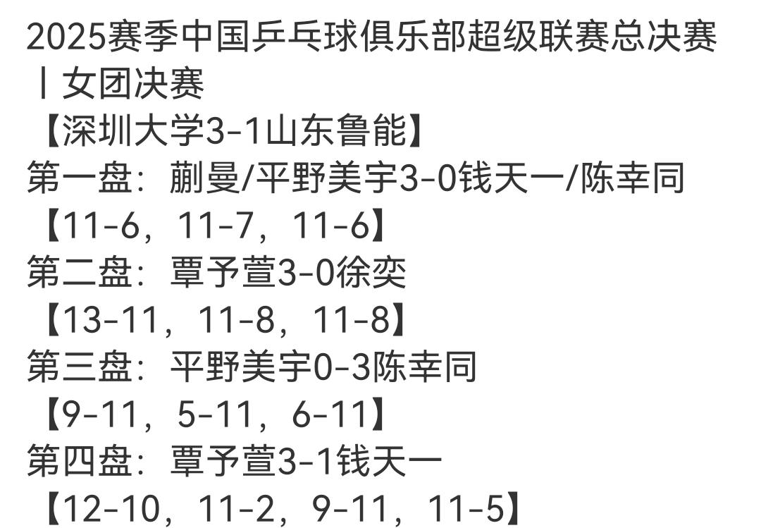 深圳大学3-1山东鲁能 2025乒超联赛女团决赛,深圳大学俱乐部获得冠军,山东鲁能屈居亚军 深圳大学俱乐部在孙颖莎缺席的情况下,仍然能够顺利击败山东鲁能俱乐部,覃予萱独得2分功可没,恭喜恭喜! 前三盘的比分都是3比0,深圳大学2-1占据了领先优势。第四盘覃予萱二度出战,对手钱天一在落后两局情况下,9-11扳回一局,最终覃予萱3-1战胜钱天一拿下比赛。