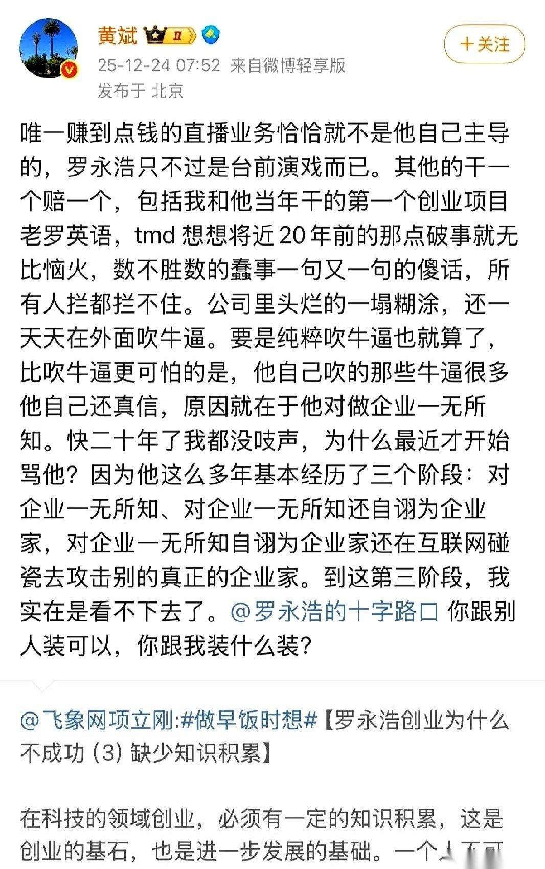 我发现一个特有意思的事儿。 一个人做生意,屡战屡败,欠了一屁股债,大家顶多说他是个理想主义的傻子,是个堂吉诃德。 可他一旦靠直播还清了债,腰杆挺直了准备东山再起,各种“汉奸”“卖国”的帽子就从四面八方飞过来了。 奇怪不? 手机、英语学校、社交软件……摊子铺得一个比一个大,故事讲得一个比一个好听,最后呢?一地鸡毛。 亏了钱的合伙人跳出来骂,说他就是个搞传销的,除了耍嘴皮子啥也不会。 这我信。老罗那张嘴,死的都能说成活的。 可这事儿,说到底,是一个愿打一个愿挨。 你投钱的时候,图的不就是他那张嘴,和他给你画的大饼吗?赌输了,就认。成年人的世界,得为自己的眼光负责。 动不动就把商业上的失败,上升到民族大义的高度,这牌打得就有点脏了。 好像只要给他扣上这顶帽子,自己当年的投资失误就瞬间变得“正义”了,就能站在道德高地上随便吐口水了。 说白了,有些人不是恨他“媚日”,是恨他还站着。 是恨他欠了6个亿,居然靠一张嘴又给还上了。 是恨他都这岁数了,还能屡败屡战,还能折腾,而自己却只能在屏幕前敲键盘。 搞垮一个人的最好方式,从来不是在业务上赢过他,而是想办法在道德上搞臭他。 这招,自古以来都好使。