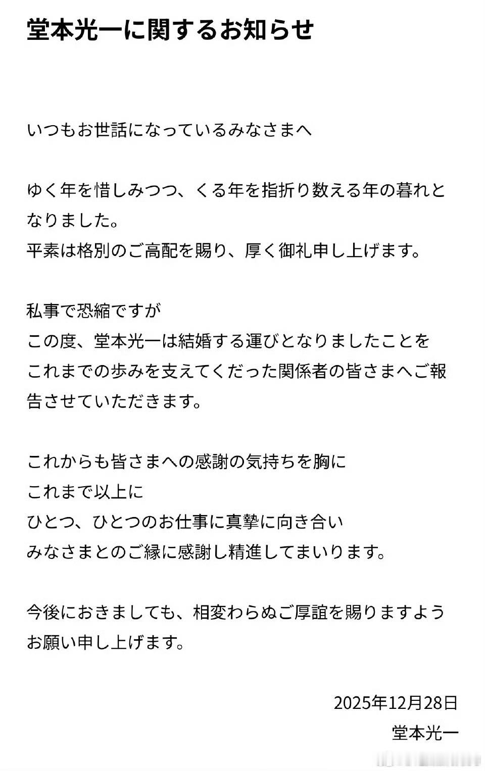 堂本光一官宣将结婚堂本光一发文官宣将进入婚姻殿堂,结婚对象是曾在《Endless