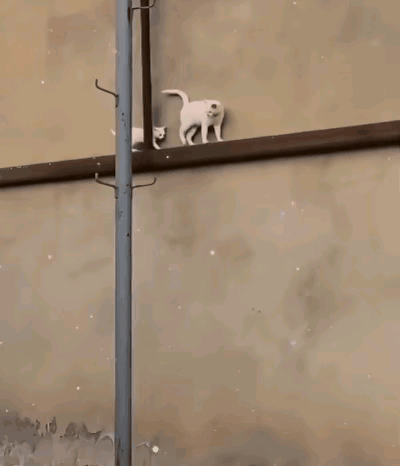 猫妈妈的每一次回头,都是对小猫咪的关心和关爱,猫妈妈跳下去是对小猫咪的鼓励,跳上去接住小猫咪是对小猫咪深深的爱。 猫妈妈在教小猫咪本领,高高的管子上,猫妈妈在前面走,小猫咪紧紧跟在猫妈妈后面,猫妈妈边走边回头照看小猫咪,有了妈妈的关照,小猫咪走的步子稳稳的。 见小猫咪胆子越来越大,步态超稳,妈妈又开始给小猫咪提高了难度。 只见猫妈妈从高高的管子上跳了下来,小猫咪吓的一动也不敢动,猫妈妈见状身子往上一跃,像是在下面接住小猫咪。 有了猫妈妈的鼓励和关爱,小猫咪什么也不怕了,从高高的管子上一跃而下,猫妈妈张开双臂接住了小猫咪。 好有爱的猫妈妈,好幸福的小猫咪,希望它们一直幸福下去。