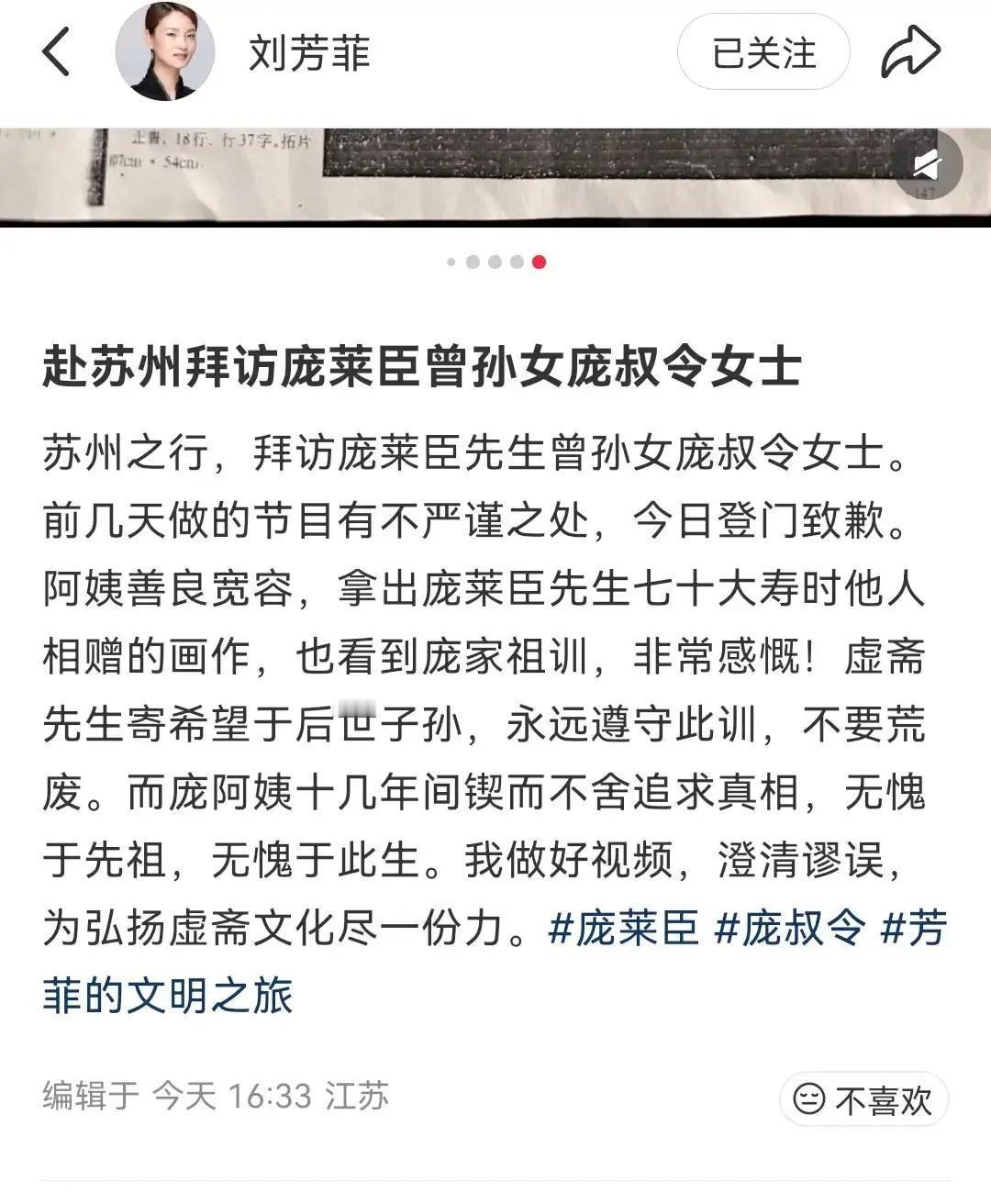 刘芳菲直播聊收藏,随口一句“庞家当年被迫把宝贝卖光”,弹幕瞬间炸锅。 三天后她拎着果篮出现在苏州老宅门口,对着庞叔令深鞠一躬,说“我嘴快说错了,给您赔不是”老太太没端架子,泡了碧螺春,翻出祖上留下的老照片给她看,两人头碰头聊了两小时,最后合了影。 网友刷到图,留言一边倒:能低头的不多见。 文化人翻车不稀奇,稀奇的是真买票上门,把对不起说到人家客厅里。 这波操作比任何公关稿都管用,直播间掉的好感又涨回来了。 敢认错就值得鼓掌,嘴快可以改,心诚才能走远。