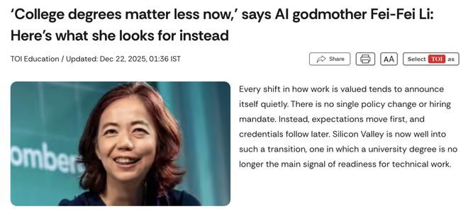 「AI教母」、斯坦福大学教授李飞飞直言,相较于学位,掌握新工具的能力更重要。