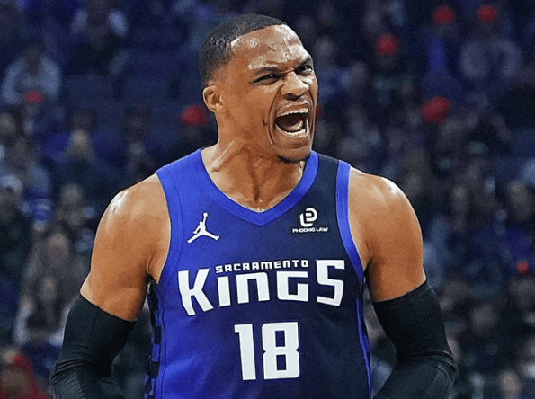 国王球员拉塞尔-威斯布鲁克全场出战28分钟,16投8中,三分9中5得到21分5篮板9助攻1抢断。