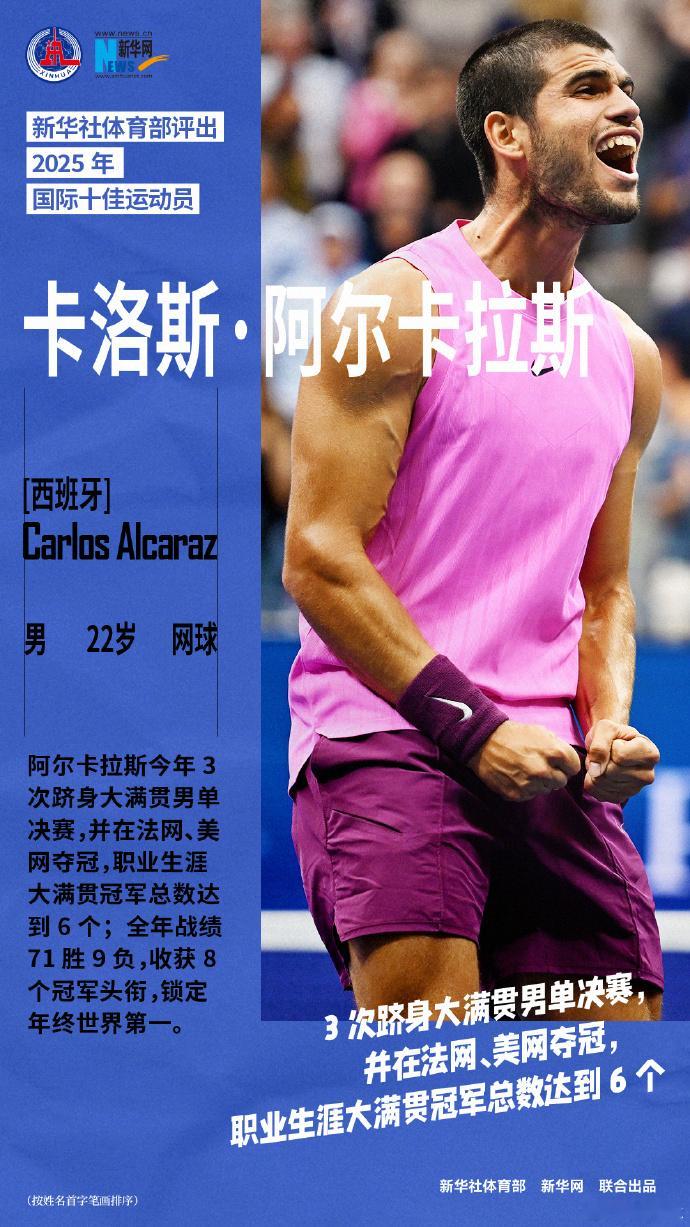 2025国际十佳运动员 新华社评出2025年国际十佳运动员:(按姓名首字笔画排序) 1、兰多·诺里斯(英国,男,26岁,赛车) 2、卡洛斯·阿尔卡拉斯(西班牙,男,22岁,网球) 3、伊利亚·马里宁(美国,男,21岁,花样滑冰) 4、陈芋汐(中国,女,20岁,跳水) 5、阿曼德·杜普兰蒂斯(瑞典,男,26岁,田径) 6、费丝·基普页真(肯尼亚,女,31岁,田径) 7、萨默·麦金托什(加拿大,女,19岁,游泳) 8、塔代伊·波加查(斯洛文尼亚,男,27岁,自行车) 9、谢伊·吉尔杰斯-亚历山大(加拿大,男,27岁,篮球) 10、奥斯曼·登贝莱(法国,男,28岁,足球)