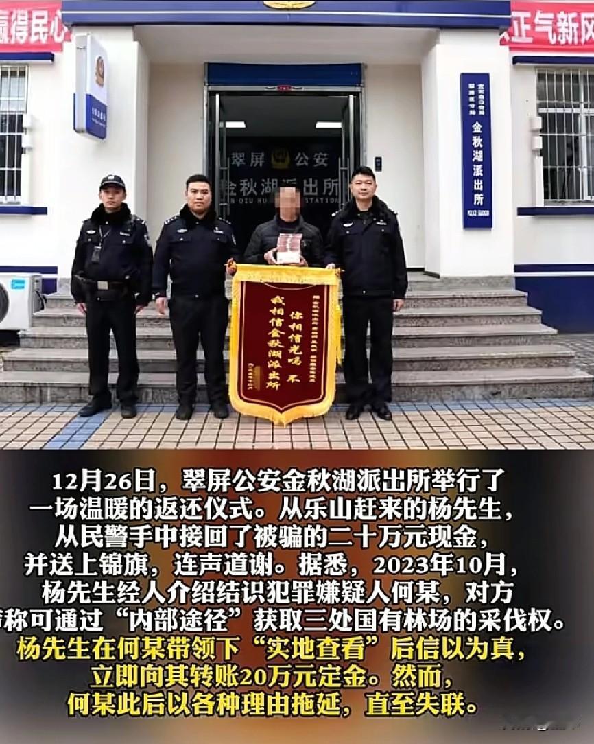 年关防骗!宜宾男子栽了20万,民警跨三千里揪出骗子。 年关将至,骗子也开始冲业绩了!宜宾杨先生就踩了大坑,2023年10月经人介绍认识何某,对方说能通过“内部途径”拿到三处国有林场采伐权,还带他“实地查看”,杨先生信以为真,当场转了20万定金。 结果何某收了钱就各种拖延,直到2025年7月,杨先生去相关部门核实,才发现所谓“林场”根本不存在,国有林地也不能卖给个人,这才惊觉被骗报警。 翠屏公安金秋湖派出所立案后,经过数月摸排,11月下旬在深圳福田区抓到了何某,还督促其家属退还了全部20万赃款。12月26日,杨先生从乐山赶来领回被骗的钱,还给民警送了锦旗致谢。 年关骗局花样多,遇到“内部渠道”“高额回报”的好事,一定要多核实、多警惕,别让辛苦钱打了水漂!