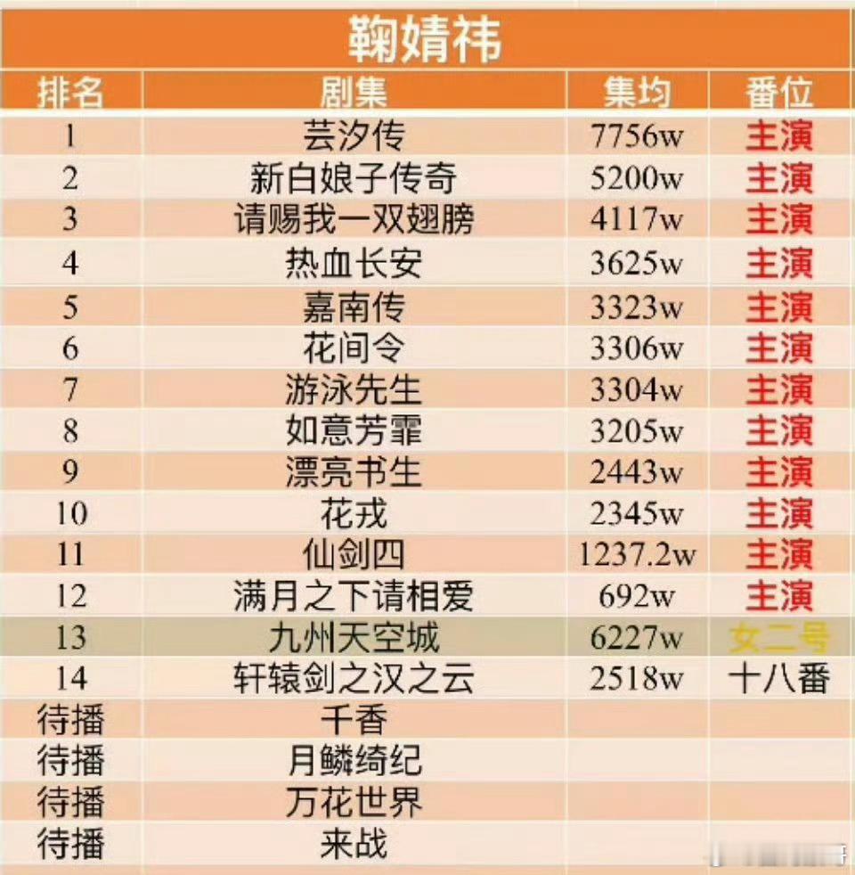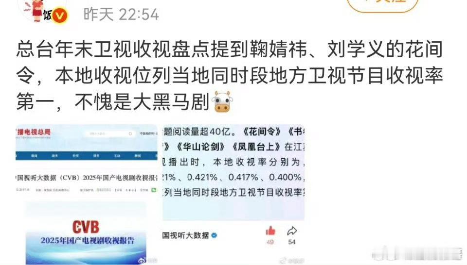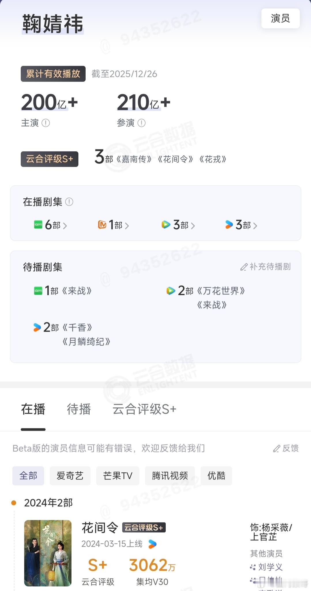 鞠婧祎的花间令是2024年3月在瘸腿平台👖播的,但网播云合热播集均3306w,A级剧打出S+的播出效果,并且2025年在荔枝台上星还拿到了该台的古装cvb收视率年冠再看一下图三、四,鞠婧祎的剧集实绩只是橘丝平时吹的少,但细看一下很强,明年小鞠又有几部大剧要播,实绩图又要添上浓墨重彩的几笔了!