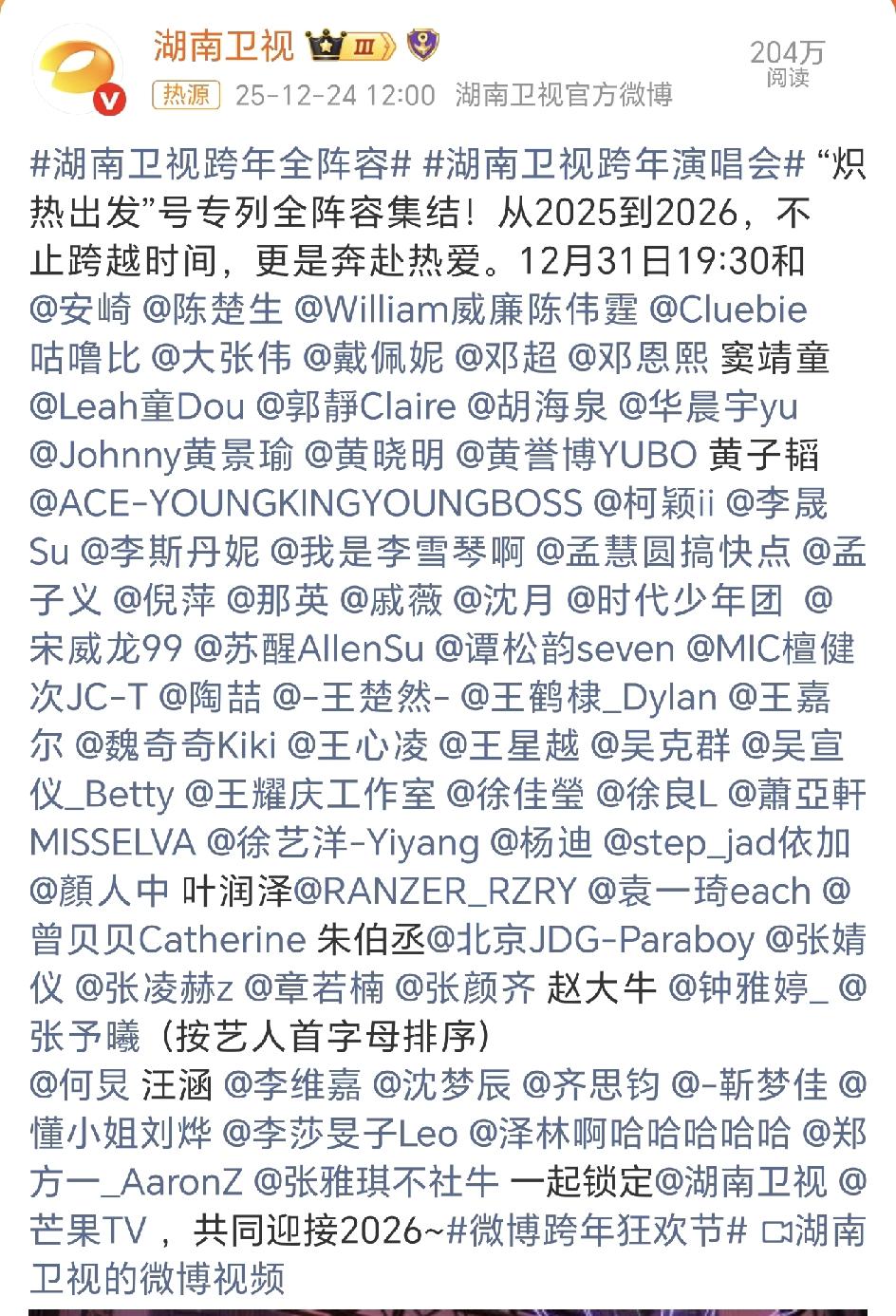 今年的跨年晚会,江苏卫视和湖南卫视将是两大热点! 在实力上讲,浙江卫视略胜一筹,演唱嘉宾九成以上具备现场演唱的实力,且中生代强将占比非常高! 从综艺性上看,湖南卫视明显占上风 湖南卫视的跨年晚会历来就是热闹, 光主持人台上一站就是一台戏! 前些年非常喜欢看湖南卫视,每年的跨年晚会必追,几年看下来,越来越感觉节奏太快了,嘉宾们上场是匆匆忙忙的,主持人的语速也是越来越快,或许是安排的节目太满,让人喘不过气来,叽里咕噜的看完了,啥也没记住[捂脸]! 其实想看的节目就那么几个,却总是凑不到一台节目里,苦了家里的遥控器,紧追慢赶的还是会落下一些现场,还有很多时间相撞,难以取舍,怎么看个晚会还这么难啊[笑哭]! 今年最想看的节目, 江苏卫视罗大佑,李宇春,薛之谦,周深,张碧晨 湖南卫视陈楚生,苏醒,窦靖童,陈伟霆,徐佳莹, 希望都能如愿!跨年晚会图鉴 湖南台跨年舞台