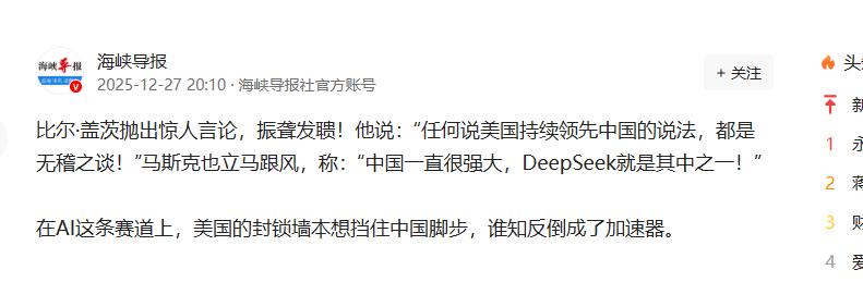 比尔·盖茨抛出惊人言论,振聋发聩!他说:“任何说美国持续领先中国的说法,都是无稽之谈!”马斯克也立马跟风,称:“中国一直很强大,DeepSeek就是其中之一!” 先说说比尔·盖茨,作为曾经定义PC时代的传奇人物,他在公开场合的发言向来分量十足。 前段时间他在接受采访时直言,美国在科技领域对比中国的优势已经微乎其微,那些觉得美国还能持续领先的说法,本质上就是自欺欺人。 这话从盖茨嘴里说出来,可不是随便的空谈,要知道他深耕科技行业几十年,见证过无数技术迭代和格局变迁,对行业趋势的判断向来有依据。 几乎在相近的时间段里,马斯克也在公开场合聊起了中国科技实力。 这位执掌特斯拉、SpaceX,同时深耕AI领域的大佬坦言,外界一直低估了中国,中国不是在崛起,而是在回到本就属于自己的高位。 他还特意点了名,说中国会做出很多伟大的事情,DeepSeek就是其中之一。 了解马斯克的人都知道,他向来不轻易夸人,尤其是在自己主攻的AI赛道上,能主动提及中国企业,足见认可的分量。 可能有人会问,马斯克为啥偏偏提到DeepSeek? 说白了,这家中国AI企业的表现确实让全球行业都眼前一亮,作为2023年才成立的初创公司,DeepSeek短短时间就推出了两代AI大模型,尤其是它的R1模型,只用了两千多个英伟达H800显卡就完成训练,成本只有550万美元,却实现了能和美国顶尖AI模型匹敌的性能。 要知道,美国同类模型的训练往往需要几万个GPU,成本更是动辄几十亿美元,这种用更少资源实现同等甚至更优效果的能力,正是中国科技企业竞争力的直观体现。 从盖茨的直言不讳,到马斯克的主动提及,这两位科技大佬的表态其实指向了同一个事实:全球科技格局已经不是单一领先的局面,中国的科技实力正在被越来越多的行业顶尖人物看见和认可。 很多人之前总觉得美国在科技领域占据绝对优势,但实际情况是,中国在AI、新能源、高端制造等多个赛道已经实现了突破。 就像DeepSeek这样的企业,不仅在技术上追平了国际顶尖水平,还在落地应用上走得更快,现在已经把技术用到了教育、医疗、金融等多个实际场景里。 其实这背后的逻辑很简单,科技竞争拼的从来不是一时的领先,而是持续创新的能力和把技术落地的效率。 中国每年培养的理工科学生数量全球最多,加上国家对科技研发的持续投入和政策扶持,形成了独特的创新生态。 这种生态下,像DeepSeek这样的企业才能快速成长,才能在被技术封锁的情况下实现突围。 盖茨和马斯克的表态,与其说是对中国的夸赞,不如说是对客观事实的陈述。 现在的科技竞争,早已不是零和博弈,更不是谁能一家独大的局面,中国科技的进步,不是靠抄袭或运气,而是靠无数工程师的深耕和整个产业生态的支撑。 以上都是个人观点,对此您有什么不同的看法,可以在评论区留言讨论!!!