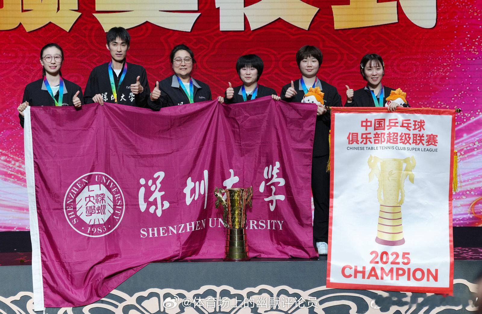 深圳大学俱乐部获得2025中国乒乓球俱乐部超级联赛女团冠军🏆!山东鲁能俱乐部获得亚军,上海龙腾俱乐部获得季军。女团决赛⬇️深圳大学3比1山东鲁能蒯曼/平野美宇3比0钱天一/陈幸同(6,7,6)覃予萱3比0徐奕(11,8,8)平野美宇0比3陈幸同(-9,-5,-6)覃予萱3比1钱天一(10,2,-9,5) ()
