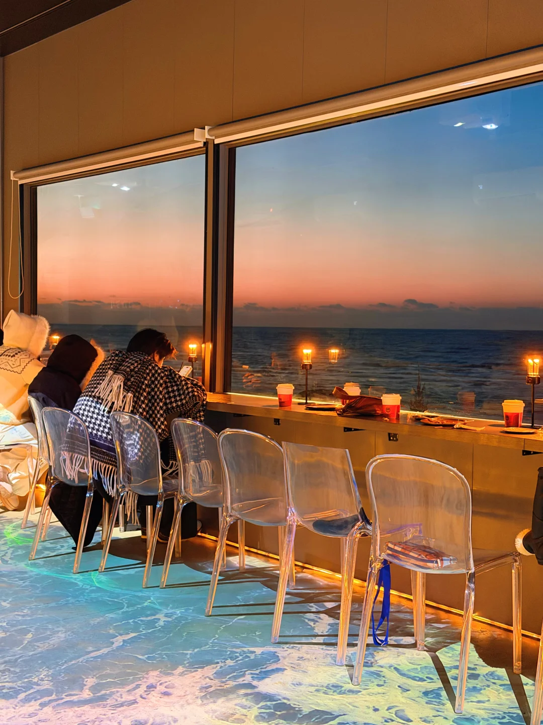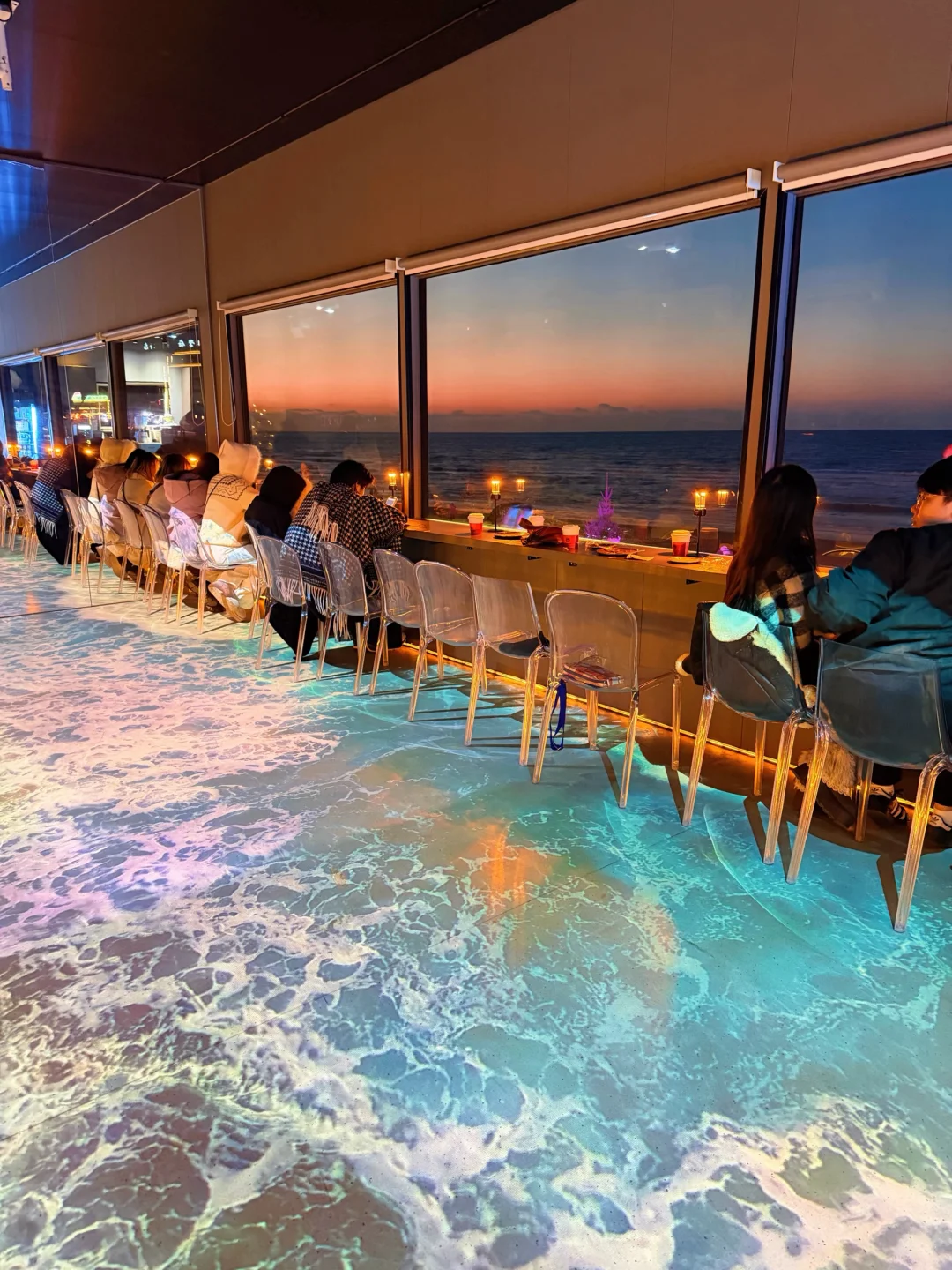 ▶️先点一杯咖啡☕️在窗边坐坐,脚边的海浪和眼前的窗景一定能拍出人生照片!一定打开live出片,能拍到海浪一直拍打脚边