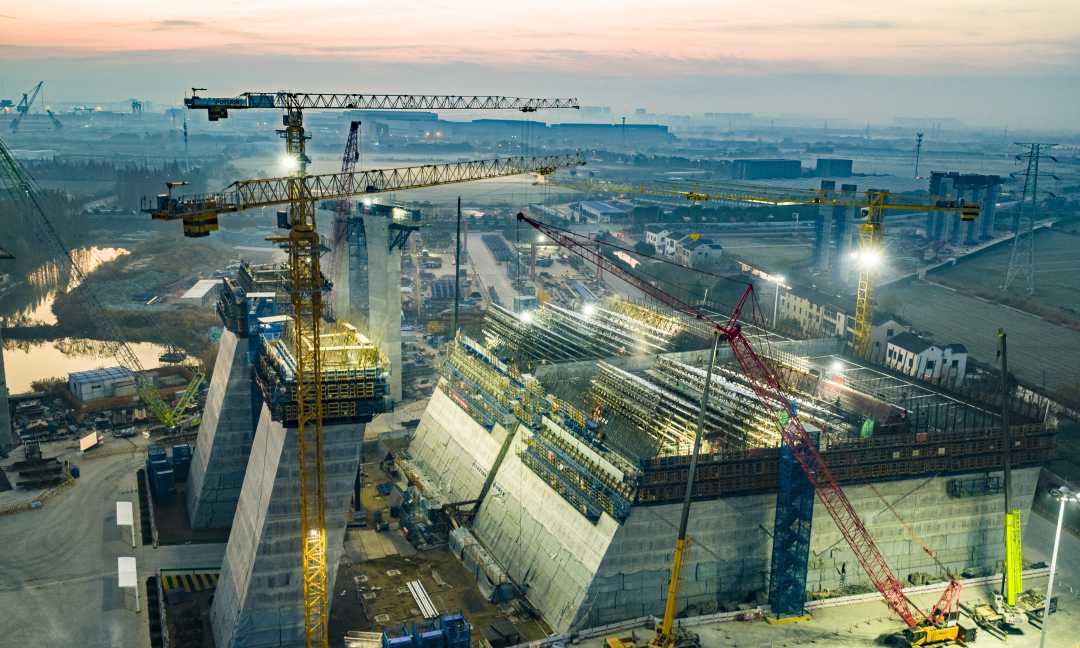 12月28日,张靖皋长江大桥施工建设现场一片繁忙。