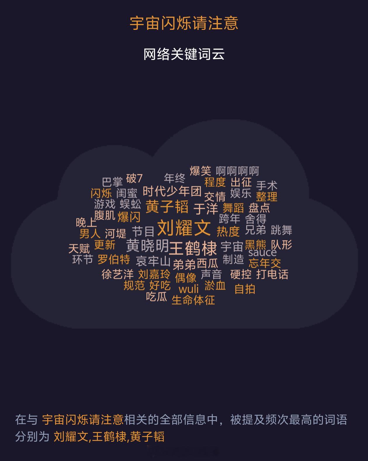 宇宙闪烁请注意开播24小时爱奇艺站内热度破8117万网络关键词云从高到底依次分别为:刘耀文、王鹤棣、黄子韬