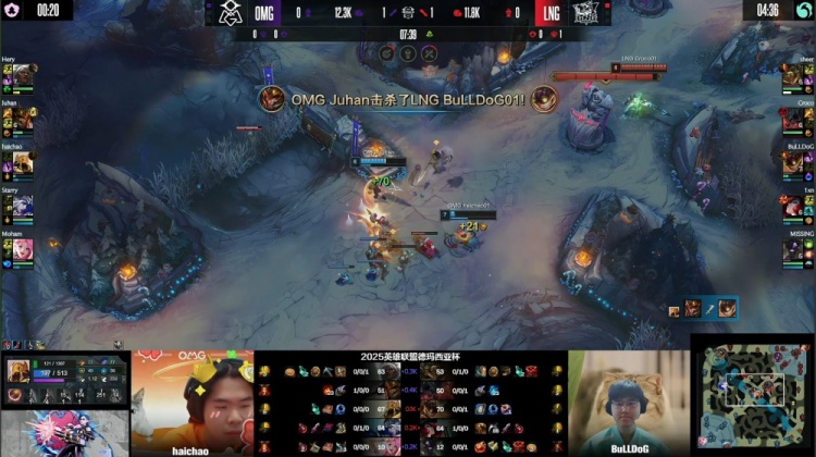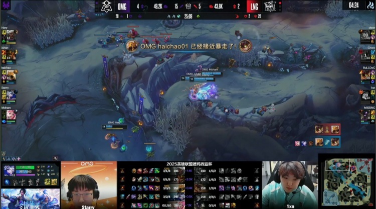 [20:29]中路团战,Juhan皇子火锅扣1xn帮助Starry拿到击杀,但Starry立刻就被sheer鳄鱼融化,双方打出2换2。厄塔汗团战,sheer鳄鱼上路落单送头,OMG五人轻松拿到厄塔汗,经济领先3k。