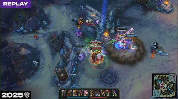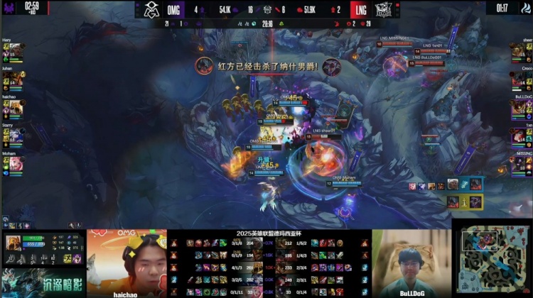 [15:33]先锋团,Hery安蓓萨逮捕sheer鳄鱼,Croco剑魔砍掉Moham萨勒芬妮,正面Starry艾希双杀到手,OMG打出1换4推掉LNG中路一塔,但先锋被Missing牛头拿到。