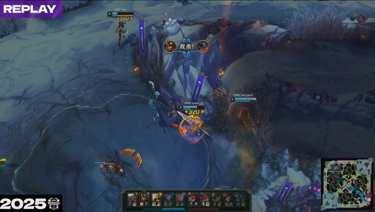 [11:47]上路河道2v2,Juhan皇子先杀sheer鳄鱼再杀Croco剑魔,OMG打出0换2,经济领先2k。
