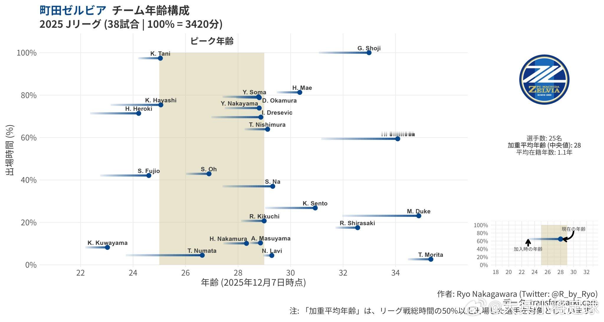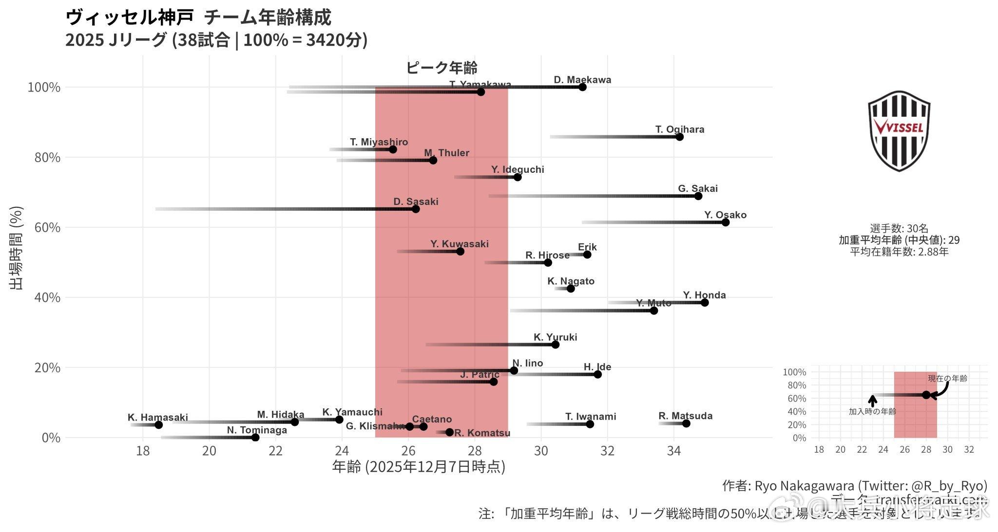 J1四大老登队:川崎、神户、广岛、町田(年龄构成X出场时间·表)