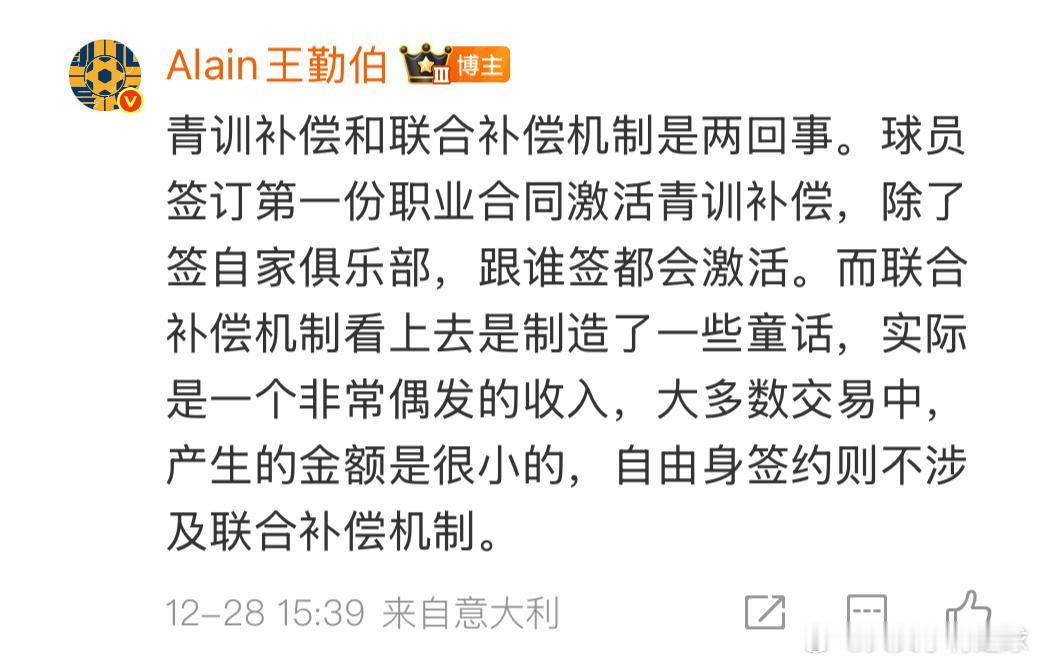 【关于“补偿”】图片中这位意大利记者既模糊了FIFA层面的“补偿”,又模糊了各国足协制定的国内“补偿”规则。【FIFA层面(国际规则)】Training Compensation(训练补偿):官方名称为Training Compensation(RSTP 第20条及Annex 4)。这是针对球员首次签订职业合同或23岁前国际转会时,支付给12-21岁期间训练过球员的俱乐部。目的是直接补偿训练成本,通常在触发事件(如首次职业注册或国际转会)时计算和支付。Solidarity Mechanism(团结机制,或称Solidarity Contribution/Payments):官方名称为Solidarity Mechanism(RSTP 第21条及Annex 5)。这是针对有转会费的国际转会时,从转会费中扣除5%分配给12-23岁期间所有训练俱乐部(按比例)。它是一种“团结贡献”,持续适用于球员职业生涯中的每次转会。这两个机制统称为Training Rewards(训练奖励)在FIFA Clearing House系统中。******【国内层面】FIFA规则主要适用于国际转会,但许多欧洲国家足协(如英格兰FA、Premier League)为保护国内青训投资,制定了独立的国内补偿系统,这些通常要求在青年球员国内转会时立即支付,而非延迟。在英格兰(Premier League和EFL的Youth Development Rules,受Elite Player Performance Plan - EPPP影响):称为Compensation 或 Academy Player Compensation(学院球员补偿),包括:Fixed/Initial Compensation(固定/初始补偿):基于球员年龄、训练年限和俱乐部类别(Category 1-4)的固定金额表,在转会时支付。Contingent Compensation(或有补偿):包括sell-on fees(未来转会分成)、appearance fees(出场费)等。如果无法协商,由Professional Football Compensation Committee (PFCC) 裁决最终金额。其他欧洲国家(如西班牙RFEF、荷兰等)也有类似国内训练补偿规则,通常称为Domestic Training Compensation 或直接Compensation for Youth Transfers,金额和触发基于国家规定。这些国内机制弥补了FIFA规则在纯国内青年转会中的空白,确保俱乐部即时收回投资。*******【欧洲国家足协国内规则(实际操作层面)】大多数欧洲顶级联赛(如英超、西班牙等)为保护青训投资,制定了独立的国内补偿系统,这些系统要求在青年转会时立即或协商支付补偿,而非等到职业阶段。英超EPPP(Elite Player Performance Plan):这是欧洲最结构化的青年补偿体系。当一名academy球员(包括12岁精英)转到另一家academy时,新俱乐部必须支付固定补偿费(基于球员年龄、训练年限和原俱乐部类别)。例如:1️⃣U14-U16阶段转会,可能每训练年达数万英镑。2️⃣补偿在转会时支付(或通过Professional Football Compensation Committee裁决),目的是立即回报原俱乐部投资,防止随意挖角。3️⃣不延迟到职业阶段——如果等到球员职业化,原俱乐部可能已错失回报机会。其他国家(如西班牙RFEF、荷兰等):国内转会有类似补偿机制,通常在转会发生时协商或固定支付(基于训练成本),而非完全推迟。这些国内规则正是为了弥补FIFA规则的“空隙”(纯国内青年转会无FIFA补偿),确保俱乐部敢于投资精英青训。*******为什么“延迟补偿”不合理?如果完全采用“等到职业阶段一次性补偿”,会严重削弱俱乐部对青年投资的激励:许多球员最终不会成为职业球员(淘汰率极高),原俱乐部可能永远拿不到钱。这会鼓励随意挖角(新俱乐部无需立即成本),破坏精英青训的稳定性。欧洲成功模式(如巴萨、阿贾克斯、英超学院)依赖即时/阶段性补偿来维持生态平衡。在顶级精英体系中,立即补偿是主流,延迟到职业阶段的模式并不合理,也不是标准实践。如果球员从未职业化,原俱乐部将一无所获,这不符合鼓励青年投资的原则。