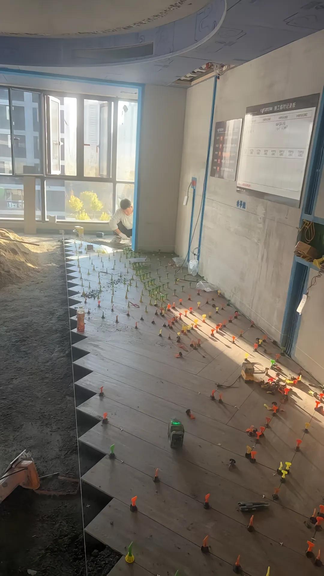 装修现场拍到离谱又好笑的一幕,瓦工师傅为了铺砖找平,在地上插满了找平器,密密麻麻
