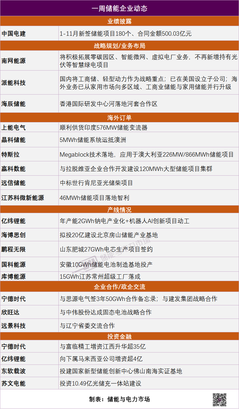 12月24日,中国电建发布2025年1月至11月主要经营情况公告:新型储能新签项目数量180个、合同金额500.03亿元。其中签约金额在5亿元以上的储能项目7个,总规模达2.87GW/10.332GWh。具体项目详情可参考:500亿,180个,中国电建1-11月签约储能项目