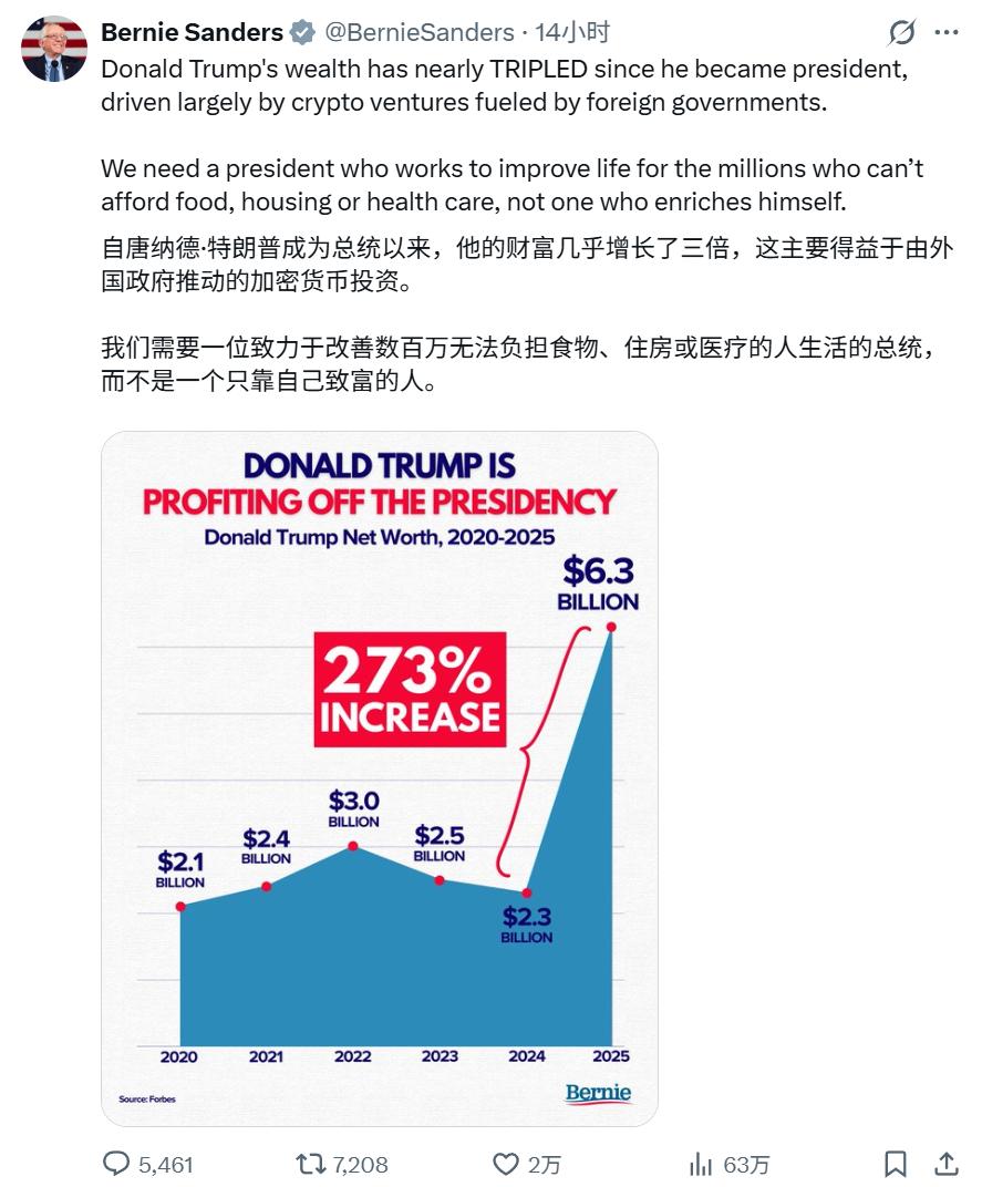 特朗普资产暴涨三倍的猫腻被戳穿了!?北京时间12月28日,美国政坛知名“硬骨头”伯尼·桑德斯发文炮轰特朗普,说特朗普自上任以来之所以财富翻了快三倍,是靠着外国政府资助的加密货币业务在后面推。他还强调说,数百万美国人连吃饭住房都成问题,总统却忙着往自己兜里揣钱。 乍看上去,这只不过是民主党和共和党之间常见的“口水战”,要知道,桑德斯早就看特朗普不顺眼睛了。而且,特朗普本来就是个把政治当生意做的“商人”,他上台要是不敛财,反倒不符合他的“人设”。 然而,这件事远不止这么简单。 说穿了就是,特朗普玩的根本不是什么数字货币,而是“权力证券化”。在传统的政治逻辑里,权钱交易往往是见不得光的,但通过加密货币这个载体,这种交易被搬到了台面上,还披上了一层“金融创新”的外衣,让外国资本能合情合理地通过买币来给未来的白宫政策“打赏”。 就是说,在法理上并不好说特朗普在搞什么贪腐。说难听点就是,特朗普光明正大地用权力换财富,还拿它没办法。 这就好比是在白宫门口设了个不记名的“功德箱”,外国金主不需要通过复杂的游说程序,只要大量买入特家族关联的数字资产,就能实现利益输送。 实事求是讲,这档子事其实并不意外,因为这不光符合特朗普的“人设”,也符合美国所谓“民主”制度的设定,就是说,从目前情况看,如果美国不专门出台什么规定约束,那特朗普这种“边当总统边炒币”的奇观大概率会成为常态。