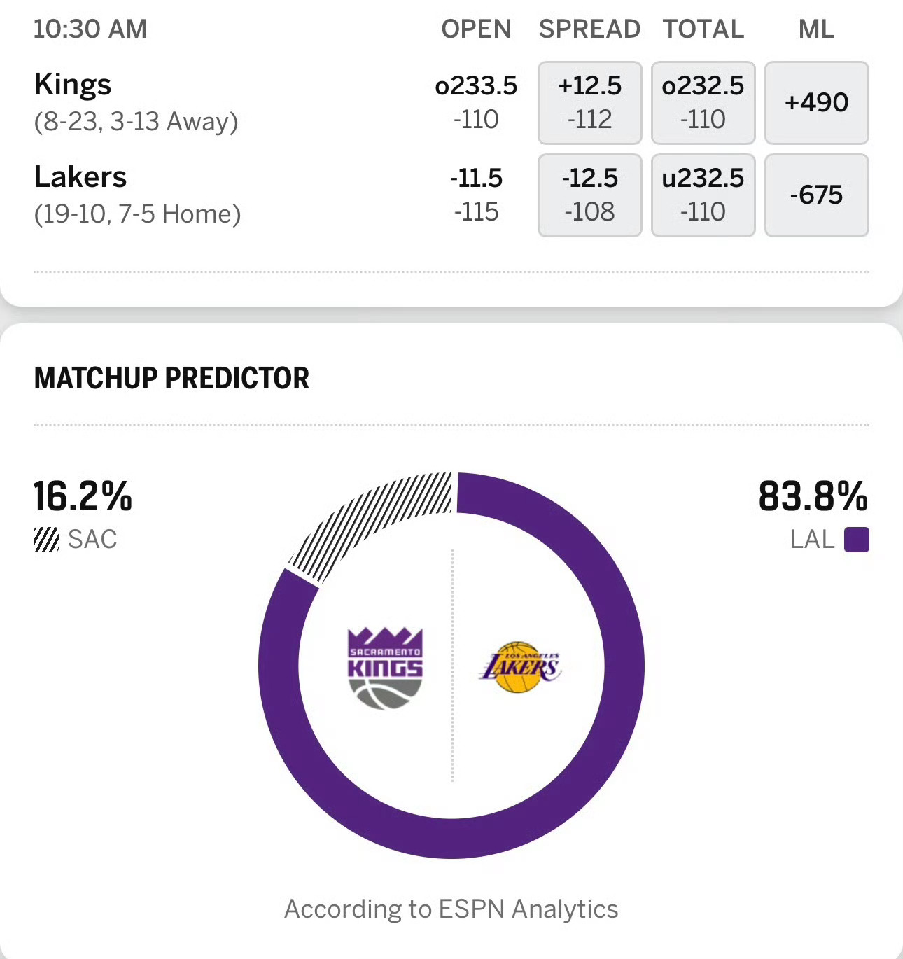 湖人明日对战国王,ESPN预测胜率高达83.8%国王vs湖人洛杉矶湖人