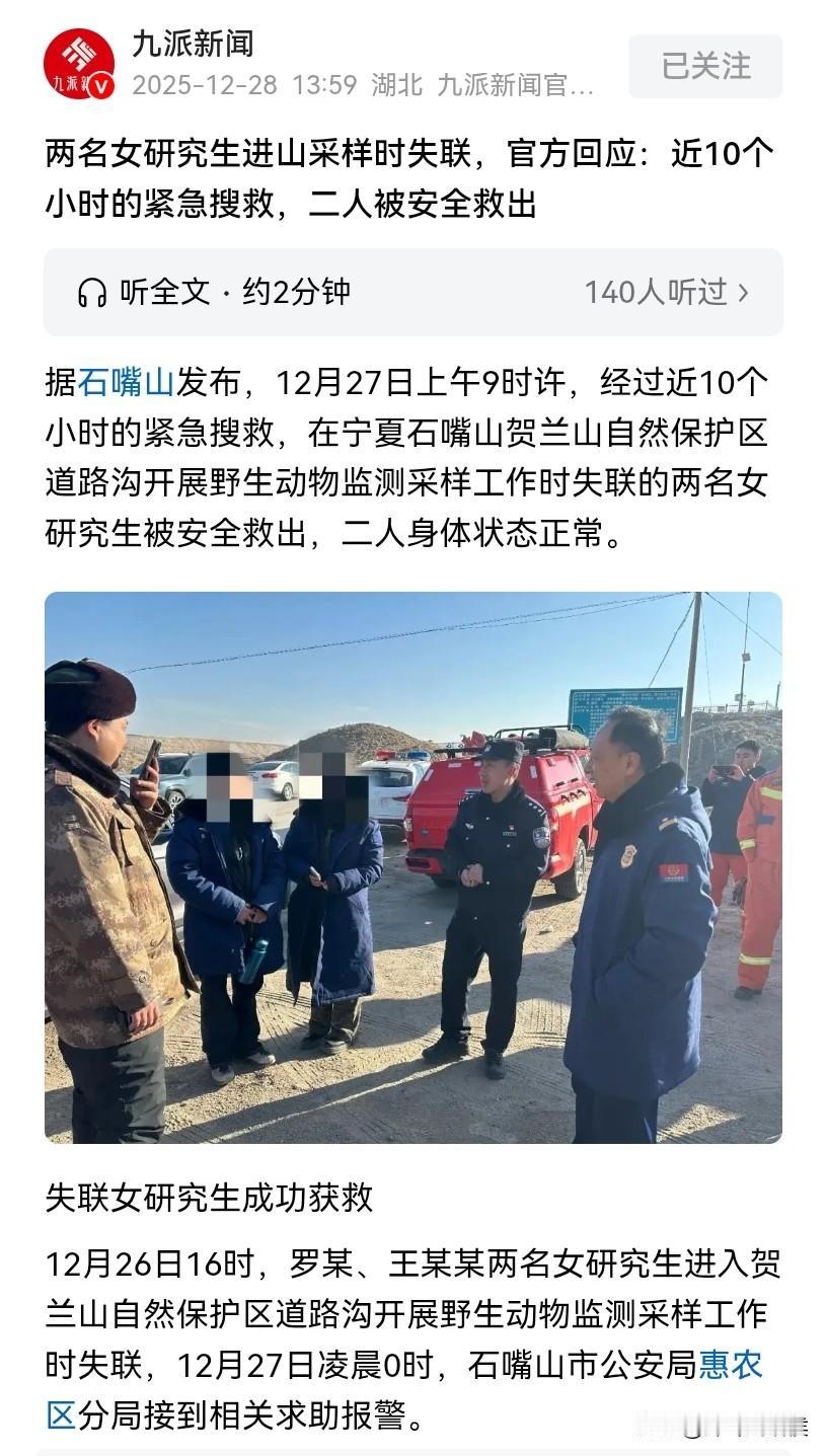 为了采集野生动物粪便,这两个憨女娃太敬业了,可惜她们忘了野外安全才是第一位的,这个贺兰山里有熊和狼,失联后,第二天才被找到。 还是要为我们可爱的救援队员点赞,因为有你们,两位姑娘才能安全脱险。 女大学生罗某和王某某,两人均为研究生在读,从12月开始,她们就在贺兰山附近采集标本,对当地的野生动物做进一步的研究,为将来的论文采集关键数据。 本来一同进山有四人,分别为三名研究生和一名管理站工作人员,当时已经是下午4点了,这两名女大学生为了采集实验样本,就跟另外两人暂时脱队了,哪曾想两人越走越远,也因此迷路了。 晚上天又黑,方向感全无,毫无疑问两人被困山中,直到凌晨才有人报警求助。 山里有多种野生动物,再加上天又冷,山路崎岖,失联人员的安危让人牵肠挂肚,同时因为地形复杂,也给搜救人员带来的难度。 幸好,在第2天的凌晨6点,无人机通过了微弱的救援的声音,锁定了失联人员的方位,最终有惊无险把两位大学生救了出来。 在野外作业,看似为了科研,实则暴露出了她们的安全意识的薄弱,她们不仅对环境风险预判不足,另外就是对团队纪律的忽视。 任何专业的行为,哪怕是科研和探索,都不能以牺牲安全为代价!
